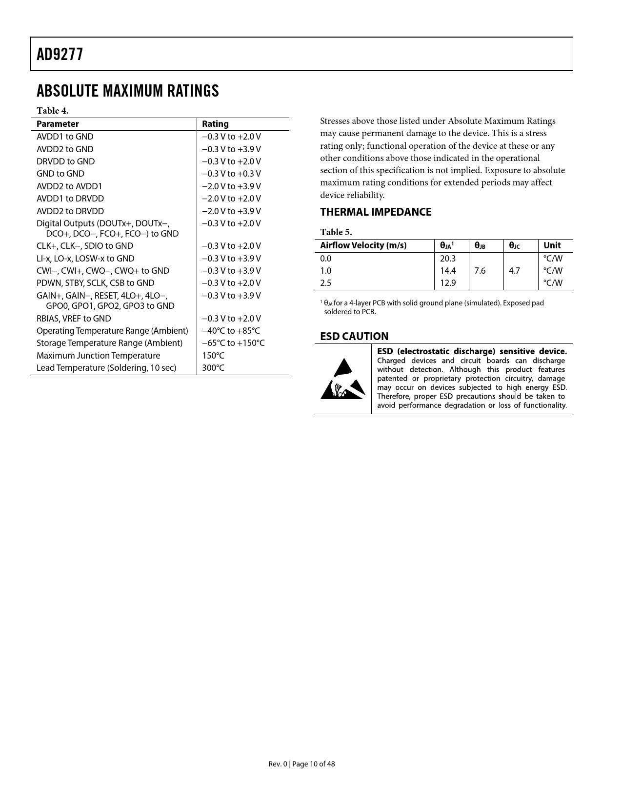 Pages / Page48 / 10 — AD9277. ABSOLUTE MAXIMUM RATINGS. Table 4. Parameter Rating. THERMAL …
