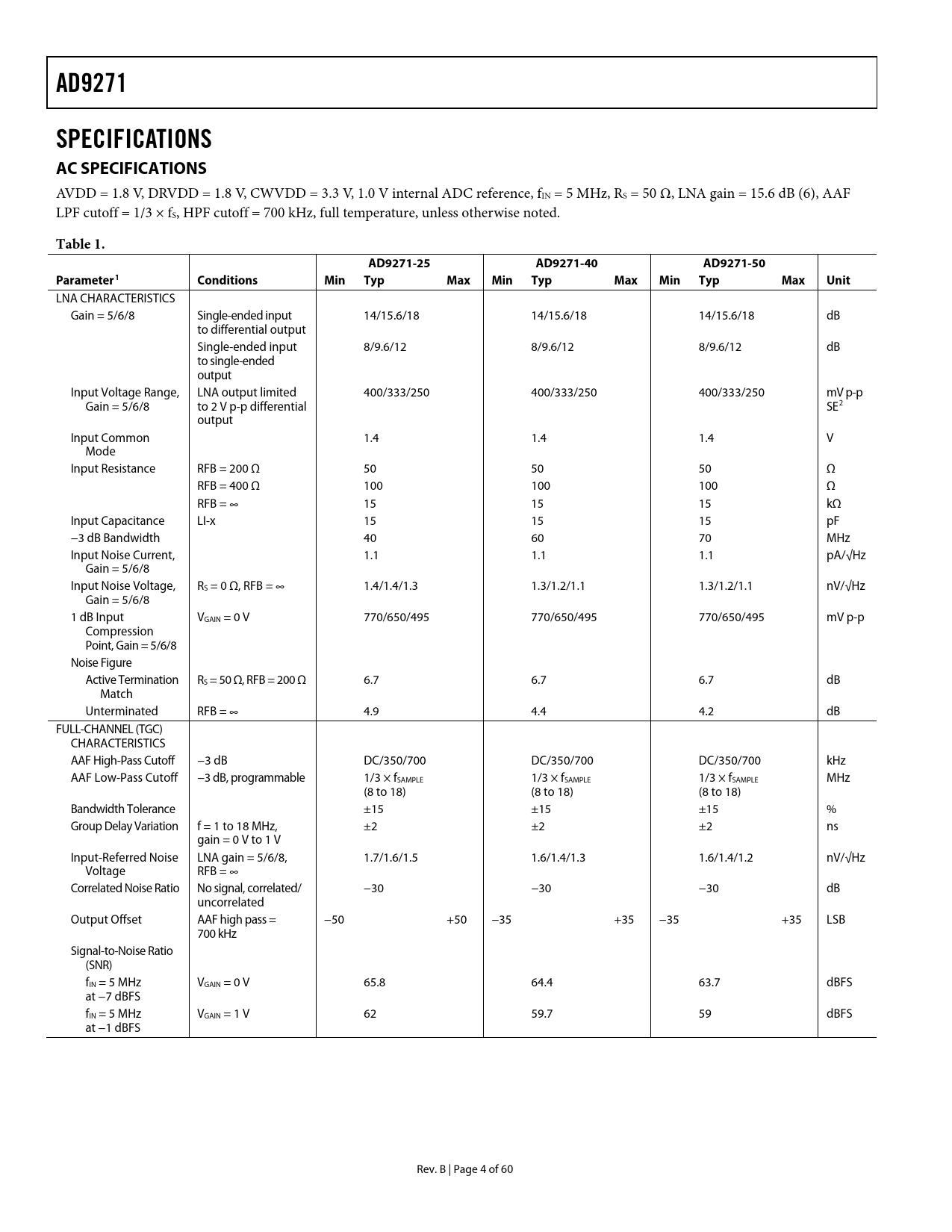 | Pages / Page | 60 / 4 — AD9271. SPECIFICATIONS AC SPECIFICATIONS. Table 1. AD9271-25. AD9271-40. … |