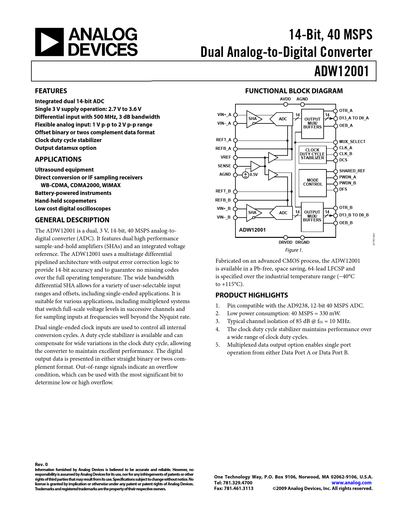 The ADW12001 is a dual, 3 V, 14-bit, 40 MSPS analog-to-