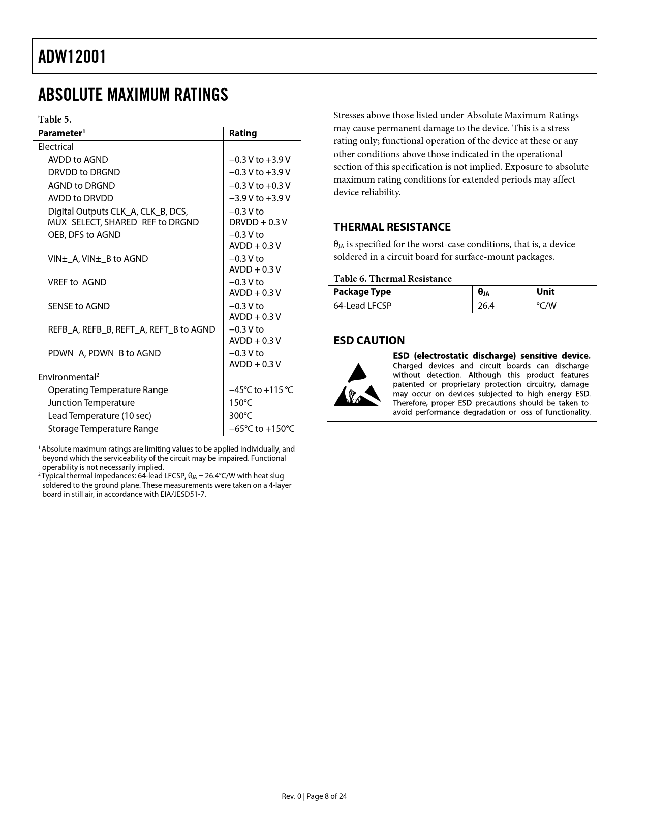 ADW12001. ABSOLUTE MAXIMUM RATINGS. Table 5. Parameter1. Rating. THERMAL RESISTANCE. Table 6. Thermal Resistance. Package Type