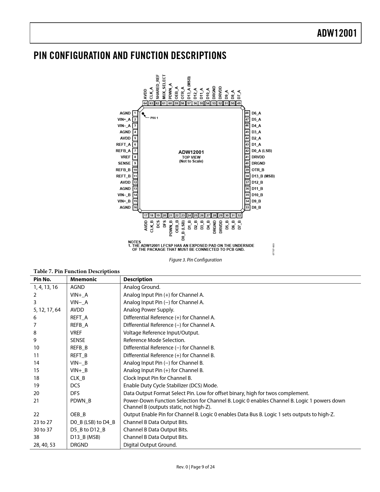 ADW12001 PIN CONFIGURATION AND FUNCTION DESCRIPTIONS F T C ) E B L S D_RE M _A D D D _A N _A _A N D D K X_SE W B G V _A _A _A HARE 13_A ( 12_A 11_A 10_A AV CL S MU PD OE OTR D D D D DR DR D9 D8 D7 64 63 62 61 60 59 58 57 56 55 54 53 52 51 50 49 AGND 1 48 D6_A VIN+_A 2 PIN 1 47 D5_A VIN–_A 3 46 D4_A AGND 4 45 D3_A AVDD 5 44 D2_A REFT_A 6 43 D1_A REFB_A 7 42 D0_A (LSB) ADW12001 VREF 8 TOP VIEW 41 DRVDD (Not to Scale) SENSE 9 40 DRGND REFB_B 10 39 OTR_B REFT_B 11 38 D13_B (MSB) AVDD 12 37 D12_B AGND 13 36 D11_B VIN–_B 14 35 D10_B VIN+_B 15 34 D9_B AGND 16 33 D8_B 17 18 19 20 21 22 23 24 25 26 27 28 29 30 31 32 S ) D DD _B _B B _B _B _B _B _B _B _B K_B N DD DCS DF B S G V AV L D1 D2 D3 D4 D5 D6 D7 CL WN OE DR DR PD D0_B ( NOTES