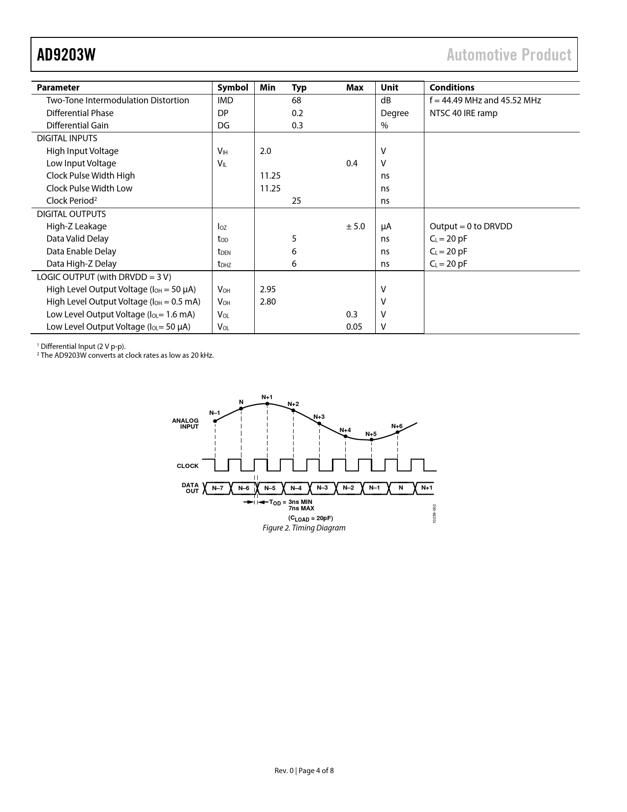 | Pages / Page | 8 / 4 — AD9203W. Automotive Product. Parameter. Symbol Min. Typ. Max. Unit. … |