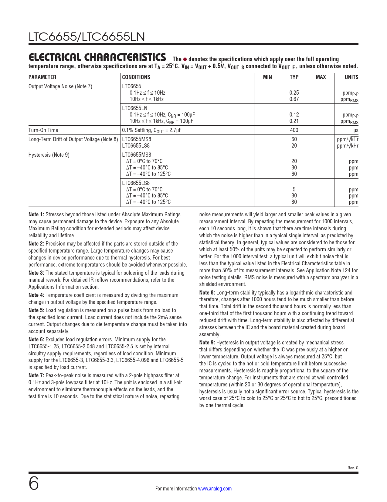 Output Voltage Noise (Note 7) LTC6655 0.1Hz ≤ f ≤ 10Hz 0.25 ppmP-P 10Hz ≤ f ≤ 1kHz 0.67 ppmRMS LTC6655LN 0.1Hz ≤ f ≤ 10Hz, CNR = 100µF 0.12 ppmP-P 10Hz ≤ f ≤ 1kHz, CNR = 100µF 0.21 ppmRMS Turn-On Time 0.1% Settling, COUT = 2.7µF 400 µs Long-Term Drift of Output Voltage (Note 8) LTC6655MS8 60 ppm/√kHr LTC6655LS8 20 ppm/√kHr Hysteresis (Note 9) LTC6655MS8 ∆T = 0°C to 70°C 20 ppm ∆T = –40°C to 85°C 30 ppm ∆T = –40°C to 125°C 60 ppm LTC6655LS8 ∆T = 0°C to 70°C 5 ppm ∆T = –40°C to 85°C 30 ppm ∆T = –40°C to 125°C 80 ppm