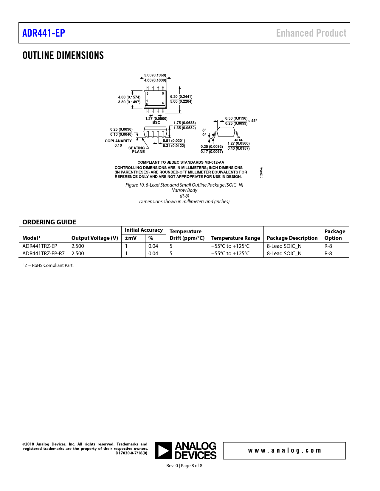 ADR441TRZ-EP 2.500 1 0.04 5 −55°C to +125°C 8-Lead SOIC_N R-8 ADR441TRZ-EP-R7 2.500 1 0.04 5 −55°C to +125°C 8-Lead SOIC_N R-8 1 Z = RoHS Compliant Part.