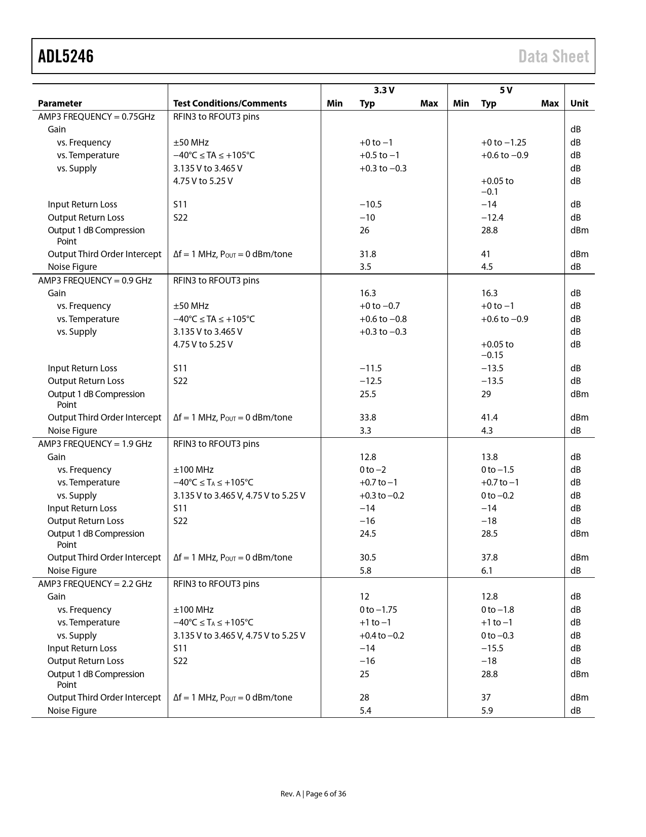 Pages / Page36 / 6 — ADL5246. Data Sheet. 3.3 V. 5 V. Parameter. Test Conditions/Comments. …