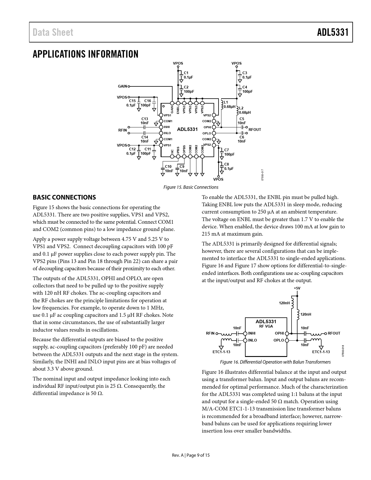 link to page 9 link to page 9 link to page 10 link to page 9 Data SheetADL5331APPLICATIONS INFORMATIONVPOSVPOSC1C30.1µF0.1µFGAINC2C4100pF100pFVPOS C15C16L10.1µF 100pFINL0.68µH L2GAENBVPS2VPS2VPS2VPS20.68µHVPS1VPS2C13C5COM1COM210nF10nFINHIRFINADL5331 OPHIRFOUTINLOOPLOC14COM1C6COM210nF10nFVPOSVPS1222VPS2MMMC12C11PBSC7NCIPBSOCOCOCO0.1µF 100pF100pFC10C9C810nF10nF0.1µF 017 VPOS 07593- Figure 15. Basic Connections BASIC CONNECTIONS To enable the ADL5331, the ENBL pin must be pul ed high. Figure 15 shows the basic connections for operating the Taking ENBL low puts the ADL5331 in sleep mode, reducing ADL5331. There are two positive supplies, VPS1 and VPS2, current consumption to 250 µA at an ambient temperature. which must be connected to the same potential. Connect COM1 The voltage on ENBL must be greater than 1.7 V to enable the and COM2 (common pins) to a low impedance ground plane. device. When enabled, the device draws 100 mA at low gain to 215 mA at maximum gain. Apply a power supply voltage between 4.75 V and 5.25 V to VPS1 and VPS2. Connect decoupling capacitors with 100 pF The ADL5331 is primarily designed for differential signals; and 0.1 µF power supplies close to each power supply pin. The however, there are several configurations that can be imple- VPS2 pins (Pins 13 and Pin 18 through Pin 22) can share a pair mented to interface the ADL5331 to single-ended applications. of decoupling capacitors because of their proximity to each other. Figure 16 and Figure 17 show options for differential-to-single- ended interfaces. Both configurations use ac-coupling capacitors The outputs of the ADL5331, OPHI and OPLO, are open at the input/output and RF chokes at the output. collectors that need to be pulled up to the positive supply +5V with 120 nH RF chokes. The ac-coupling capacitors and the RF chokes are the principle limitations for operation at 120nH low frequencies. For example, to operate down to 1 MHz, use 0.1 µF ac coupling capacitors and 1.5 µH RF chokes. Note 120nH that in some circumstances, the use of substantially larger ADL5331 inductor values results in oscillations. 10nFRF VGA10nFRFININHIOPHIRFOUT Because the differential outputs are biased to the positive INLOOPLO supply, ac-coupling capacitors (preferably 100 pF) are needed 10nF10nF 018 between the ADL5331 outputs and the next stage in the system. ETC1-1-13ETC1-1-13 07593- Similarly, the INHI and INLO input pins are at bias voltages of Figure 16. Differential Operation with Balun Transformers about 3.3 V above ground. Figure 16 illustrates differential balance at the input and output The nominal input and output impedance looking into each using a transformer balun. Input and output baluns are recom- individual RF input/output pin is 25 Ω. Consequently, the mended for optimal performance. Much of the characterization differential impedance is 50 Ω. for the ADL5331 was completed using 1:1 baluns at the input and output for a single-ended 50 Ω match. Operation using M/A-COM ETC1-1-13 transmission line transformer baluns is recommended for a broadband interface; however, narrow- band baluns can be used for applications requiring lower insertion loss over smaller bandwidths. Rev. A | Page 9 of 15 Document Outline FEATURES APPLICATIONS FUNCTIONAL BLOCK DIAGRAM GENERAL DESCRIPTION REVISION HISTORY SPECIFICATIONS ABSOLUTE MAXIMUM RATINGS ESD CAUTION PIN CONFIGURATION AND FUNCTION DESCRIPTIONS TYPICAL PERFORMANCE CHARACTERISTICS THEORY OF OPERATION APPLICATIONS INFORMATION BASIC CONNECTIONS GAIN CONTROL INPUT CMTS TRANSMIT APPLICATION Interfacing to AD9789 INTERFACING TO AN IQ MODULATOR SOLDERING INFORMATION EVALUATION BOARD SCHEMATIC OUTLINE DIMENSIONS ORDERING GUIDE