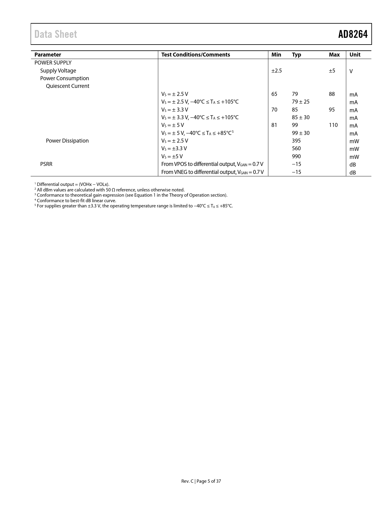 Pages / Page37 / 5 — Data Sheet. AD8264. Parameter. Test Conditions/Comments. Min. Typ. Max. …