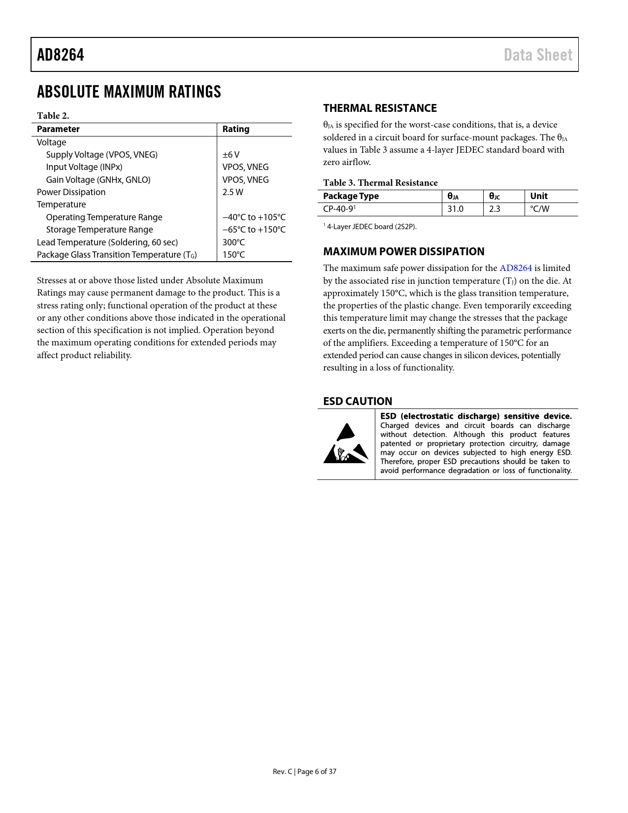 Pages / Page37 / 6 — AD8264. Data Sheet. ABSOLUTE MAXIMUM RATINGS. THERMAL RESISTANCE. Table …