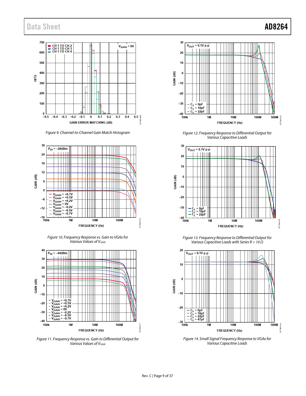 73 07 07 Figure 9. Channel-to-Channel Gain Match Histogram Figure 12. Frequency Response to Differential Output for Various Capacitive Loads