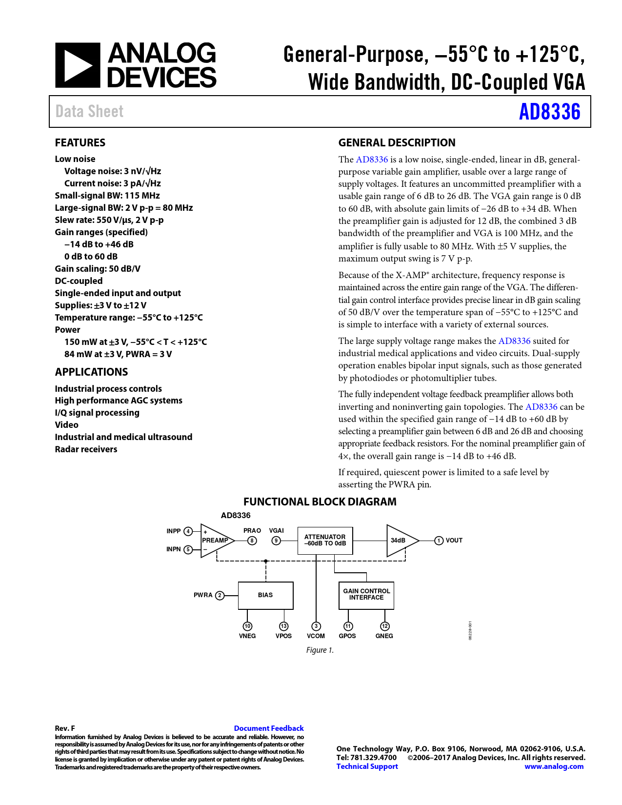 General-Purpose, −55°C to +125°C,. Wide Bandwidth, DC-Coupled VGA. Data Sheet. AD8336. FEATURES. GENERAL DESCRIPTION. Low noise