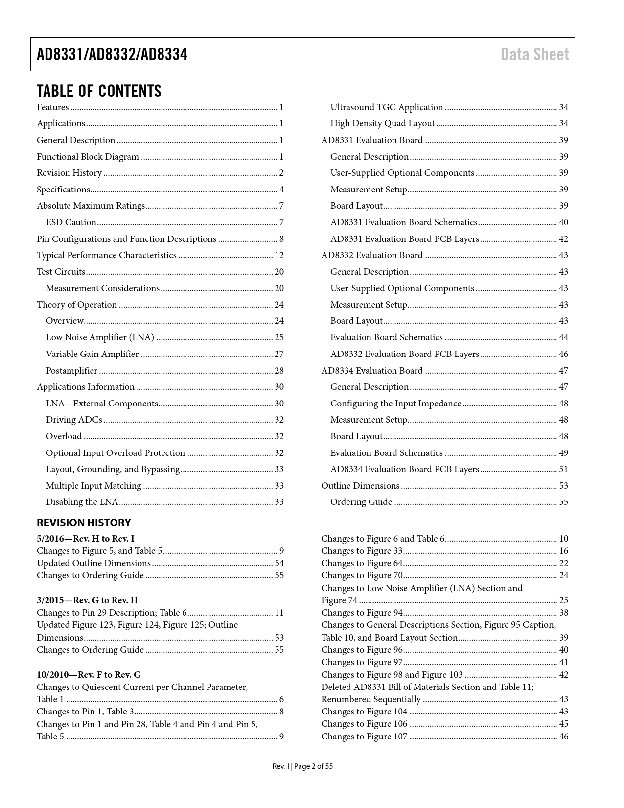 Pages / Page55 / 2 — AD8331/AD8332/AD8334. Data Sheet. TABLE OF CONTENTS. REVISION HISTORY …