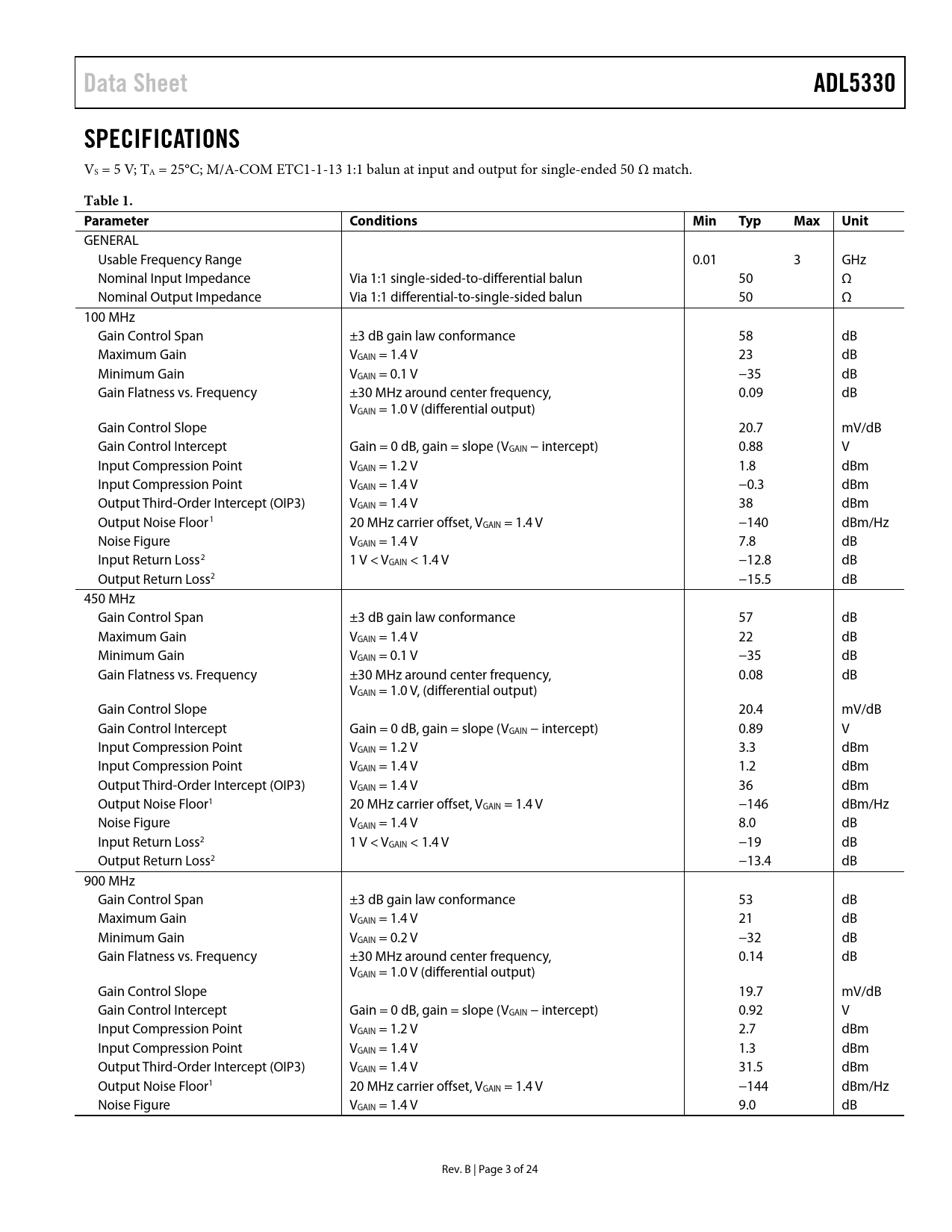 Pages / Page24 / 3 — Data Sheet. ADL5330. SPECIFICATIONS. Table 1. Parameter. Conditions. Min. …