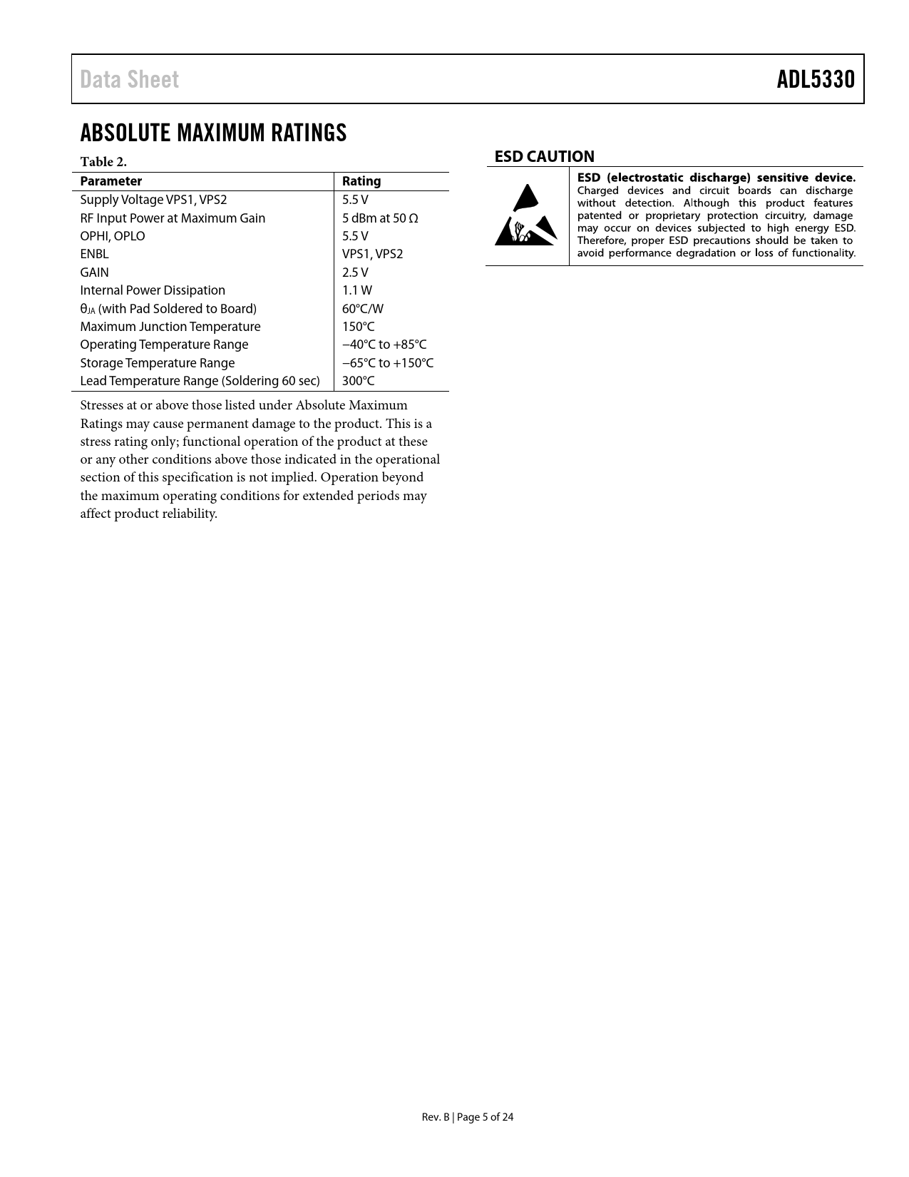 Data SheetADL5330ABSOLUTE MAXIMUM RATINGS Table 2.ESD CAUTIONParameterRating Supply Voltage VPS1, VPS2 5.5 V RF Input Power at Maximum Gain 5 dBm at 50 Ω OPHI, OPLO 5.5 V ENBL VPS1, VPS2 GAIN 2.5 V Internal Power Dissipation 1.1 W θ JA (with Pad Soldered to Board) 60°C/W Maximum Junction Temperature 150°C Operating Temperature Range −40°C to +85°C Storage Temperature Range −65°C to +150°C Lead Temperature Range (Soldering 60 sec) 300°C Stresses at or above those listed under Absolute Maximum Ratings may cause permanent damage to the product. This is a stress rating only; functional operation of the product at these or any other conditions above those indicated in the operational section of this specification is not implied. Operation beyond the maximum operating conditions for extended periods may affect product reliability. Rev. B | Page 5 of 24 Document Outline FEATURES APPLICATIONS FUNCTIONAL BLOCK DIAGRAM GENERAL DESCRIPTION TABLE OF CONTENTS REVISION HISTORY SPECIFICATIONS ABSOLUTE MAXIMUM RATINGS ESD CAUTION PIN CONFIGURATION AND FUNCTION DESCRIPTIONS TYPICAL PERFORMANCE CHARACTERISTICS THEORY OF OPERATION APPLICATIONS INFORMATION BASIC CONNECTIONS RF INPUT/OUTPUT INTERFACE GAIN CONTROL INPUT AUTOMATIC GAIN CONTROL INTERFACING TO AN IQ MODULATOR WCDMA TRANSMIT APPLICATION CDMA2000 TRANSMIT APPLICATION SOLDERING INFORMATION EVALUATION BOARD OUTLINE DIMENSIONS ORDERING GUIDE