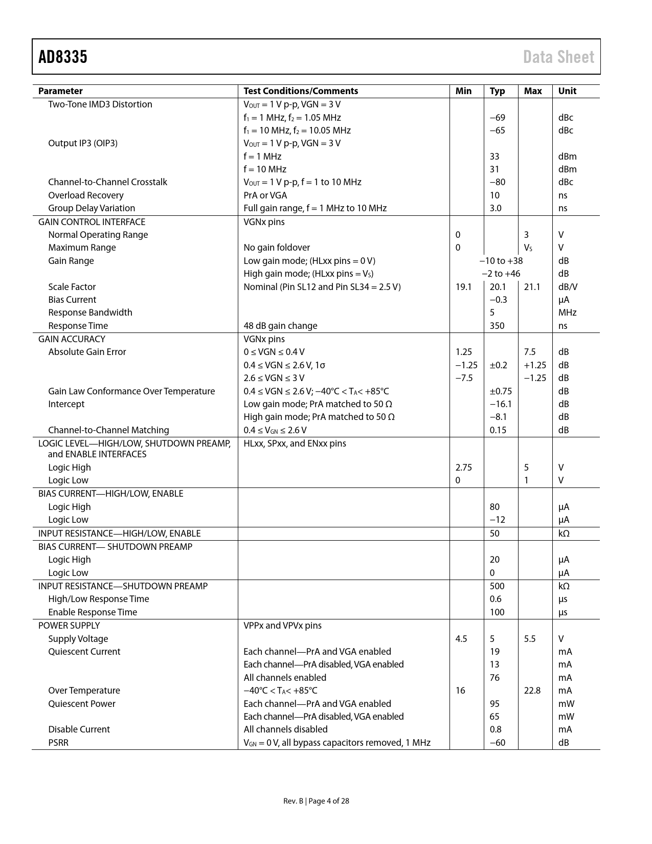 Pages / Page28 / 4 — AD8335. Data Sheet. Parameter Test. Conditions/Comments. Min. Typ. Max. …
