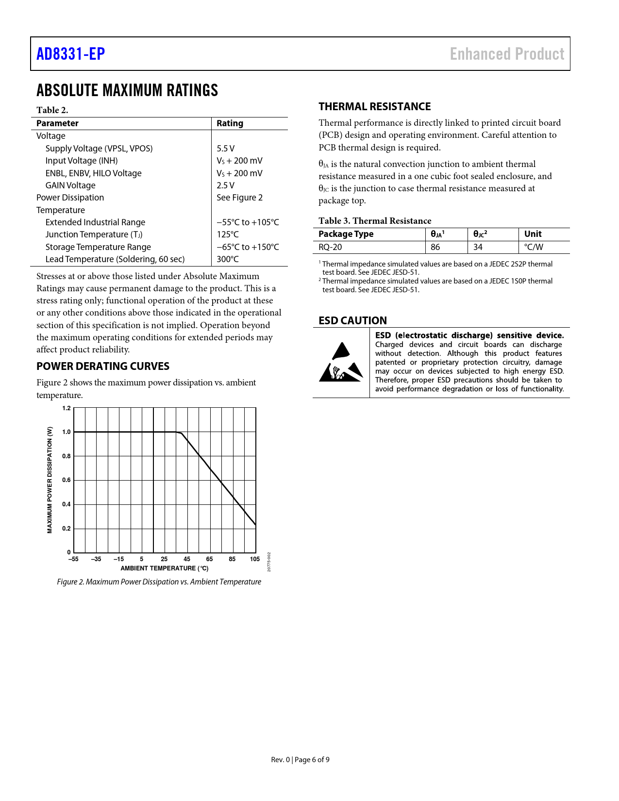 link to page 6 link to page 6 AD8331-EPEnhanced ProductABSOLUTE MAXIMUM RATINGS Table 2.THERMAL RESISTANCEParameterRating Thermal performance is directly linked to printed circuit board Voltage (PCB) design and operating environment. Careful attention to Supply Voltage (VPSL, VPOS) 5.5 V PCB thermal design is required. Input Voltage (INH) VS + 200 mV θJA is the natural convection junction to ambient thermal ENBL, ENBV, HILO Voltage VS + 200 mV resistance measured in a one cubic foot sealed enclosure, and GAIN Voltage 2.5 V θJC is the junction to case thermal resistance measured at Power Dissipation See Figure 2 package top. Temperature Extended Industrial Range −55°C to +105°C Table 3. Thermal Resistance Junction Temperature (T 12 J) 125°C Package TypeθJAθJCUnit Storage Temperature Range −65°C to +150°C RQ-20 86 34 °C/W Lead Temperature (Soldering, 60 sec) 300°C 1 Thermal impedance simulated values are based on a JEDEC 2S2P thermal Stresses at or above those listed under Absolute Maximum test board. See JEDEC JESD-51. 2 Thermal impedance simulated values are based on a JEDEC 1S0P thermal Ratings may cause permanent damage to the product. This is a test board. See JEDEC JESD-51. stress rating only; functional operation of the product at these or any other conditions above those indicated in the operational section of this specification is not implied. Operation beyond ESD CAUTION the maximum operating conditions for extended periods may affect product reliability. POWER DERATING CURVES Figure 2 shows the maximum power dissipation vs. ambient temperature. 1.2)1.0(W N IO T0.8PAISSI D0.6ER W0.4M POMU XI0.2MA0–55–35–15525456585105 002 AMBIENT TEMPERATURE (°C) 20775- Figure 2. Maximum Power Dissipation vs. Ambient Temperature Rev. 0 | Page 6 of 9 Document Outline FEATURES ENHANCED PRODUCT FEATURES APPLICATIONS GENERAL DESCRIPTION FUNCTIONAL BLOCK DIAGRAM TABLE OF CONTENTS REVISION HISTORY SPECIFICATIONS ABSOLUTE MAXIMUM RATINGS POWER DERATING CURVES THERMAL RESISTANCE ESD CAUTION PIN CONFIGURATION AND FUNCTION DESCRIPTIONS TYPICAL PERFORMANCE CHARACTERISTICS OUTLINE DIMENSIONS ORDERING GUIDE