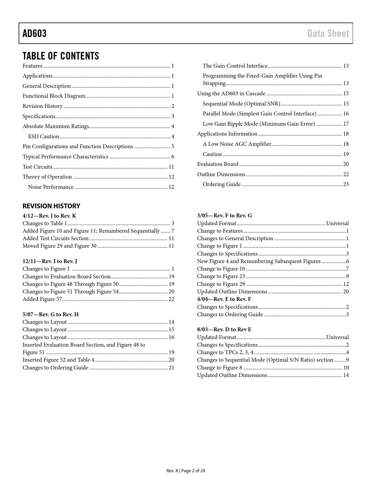 link to page 1 link to page 1 link to page 1 link to page 1 link to page 2 link to page 3 link to page 4 link to page 4 link to page 5 link to page 6 link to page 11 link to page 12 link to page 12 link to page 13 link to page 13 link to page 13 link to page 15 link to page 15 link to page 16 link to page 17 link to page 18 link to page 18 link to page 19 link to page 20 link to page 22 link to page 23 AD603Data SheetTABLE OF CONTENTS Features .. 1 The Gain Control Interface ... 13 Applications ... 1 Programming the Fixed-Gain Amplifier Using Pin General Description ... 1 Strapping .. 13 Functional Block Diagram .. 1 Using the AD603 in Cascade .. 15 Revision History ... 2 Sequential Mode (Optimal SNR) ... 15 Specifications ... 3 Parallel Mode (Simplest Gain Control Interface) .. 16 Absolute Maximum Ratings .. 4 Low Gain Ripple Mode (Minimum Gain Error) ... 17 ESD Caution .. 4 Applications Information .. 18 Pin Configurations and Function Descriptions ... 5 A Low Noise AGC Amplifier .. 18 Typical Performance Characteristics ... 6 Caution .. 19 Test Circuits ... 11 Evaluation Board .. 20 Theory of Operation .. 12 Outline Dimensions ... 22 Noise Performance ... 12 Ordering Guide .. 23 REVISION HISTORY4/12—Rev. J to Rev. K3/05—Rev. F to Rev. G Changes to Table 1 .. 3 Updated Format .. Universal Added Figure 10 and Figure 11; Renumbered Sequentially ... 7 Change to Features .. 1 Added Test Circuits Section .. 11 Changes to General Description ... 1 Moved Figure 29 and Figure 30 .. 11 Change to Figure 1 .. 1 Changes to Specifications ... 3 12/11—Rev. I to Rev. J New Figure 4 and Renumbering Subsequent Figures .. 6 Changes to Figure 1 ... 1 Change to Figure 10 .. 7 Changes to Evaluation Board Section .. 19 Change to Figure 23 .. 9 Changes to Figure 48 Through Figure 50 .. 19 Change to Figure 29 ... 12 Changes to Figure 51 Through Figure 54 .. 20 Updated Outline Dimensions ... 20 Added Figure 57 .. 22 4/04—Rev. E to Rev. F Changes to Specifications ... 2 5/07—Rev. G to Rev. H Changes to Ordering Guide ... 3 Changes to Layout .. 14 Changes to Layout .. 15 8/03—Rev. D to Rev E Changes to Layout .. 16 Updated Format .. Universal Inserted Evaluation Board Section, and Figure 48 to Changes to Specifications ... 2 Figure 51 .. 19 Changes to TPCs 2, 3, 4 .. 4 Inserted Figure 52 and Table 4 .. 20 Changes to Sequential Mode (Optimal S/N Ratio) section ... 9 Changes to Ordering Guide .. 21 Change to Figure 8 ... 10 Updated Outline Dimensions ... 14 Rev. K | Page 2 of 24 Document Outline Features Applications General Description Functional Block Diagram Revision History Specifications Absolute Maximum Ratings ESD Caution Pin Configurations and Function Descriptions Typical Performance Characteristics Test Circuits Theory of Operation Noise Performance The Gain Control Interface Programming the Fixed-Gain Amplifier Using Pin Strapping Using the AD603 in Cascade Sequential Mode (Optimal SNR) Parallel Mode (Simplest Gain Control Interface) Low Gain Ripple Mode (Minimum Gain Error) Applications Information A Low Noise AGC Amplifier Caution Evaluation Board Outline Dimensions Ordering Guide