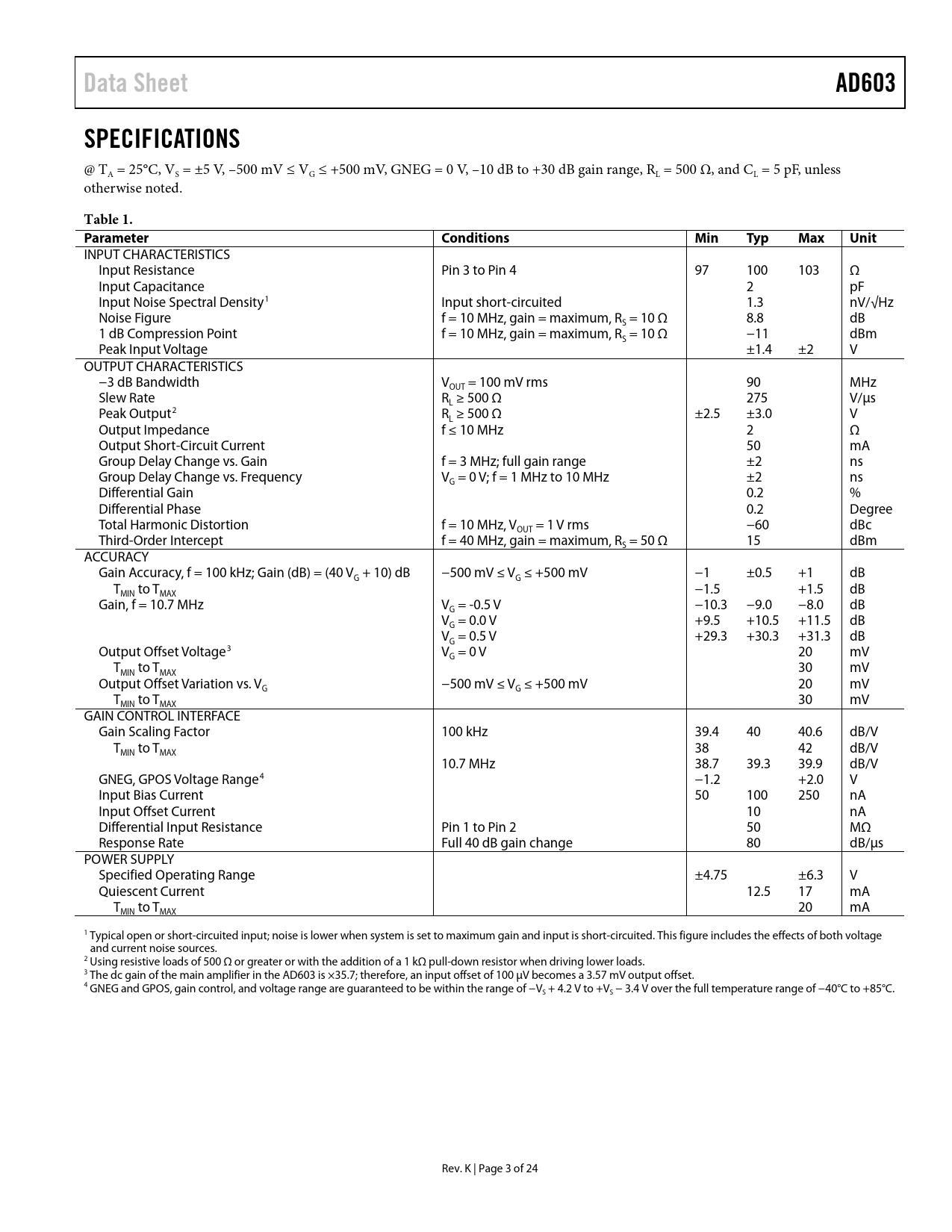 Pages / Page24 / 3 — Data Sheet. AD603. SPECIFICATIONS. Table 1. Parameter. Conditions. Min. …