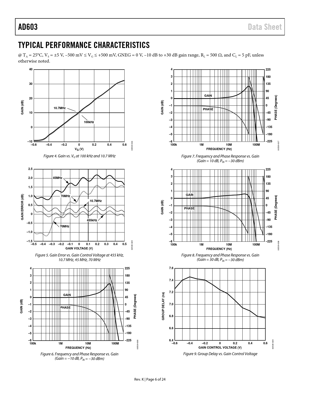 AD603. Data Sheet. TYPICAL PERFORMANCE CHARACTERISTICS. 225. 180. 135. GAIN. rees). Deg. N (. 10.7MHz. PHASE. –45. HAS. –90. 100kHz. –135. –180. –10. –225