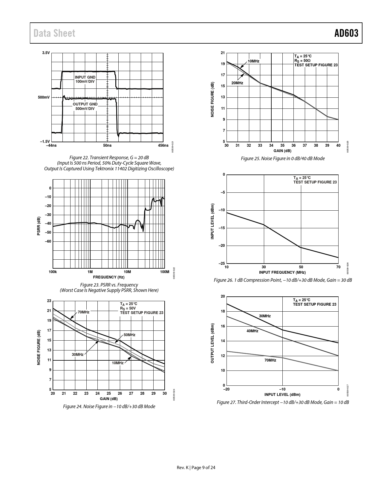 00539- Figure 27. Third-Order Intercept −10 dB/+30 dB Mode, Gain = 10 dB Figure 24. Noise Figure in −10 dB/+30 dB Mode Rev. K | Page 9 of 24 Document Outline Features Applications General Description Functional Block Diagram Revision History Specifications Absolute Maximum Ratings ESD Caution Pin Configurations and Function Descriptions Typical Performance Characteristics Test Circuits Theory of Operation Noise Performance The Gain Control Interface Programming the Fixed-Gain Amplifier Using Pin Strapping Using the AD603 in Cascade Sequential Mode (Optimal SNR) Parallel Mode (Simplest Gain Control Interface) Low Gain Ripple Mode (Minimum Gain Error) Applications Information A Low Noise AGC Amplifier Caution Evaluation Board Outline Dimensions Ordering Guide