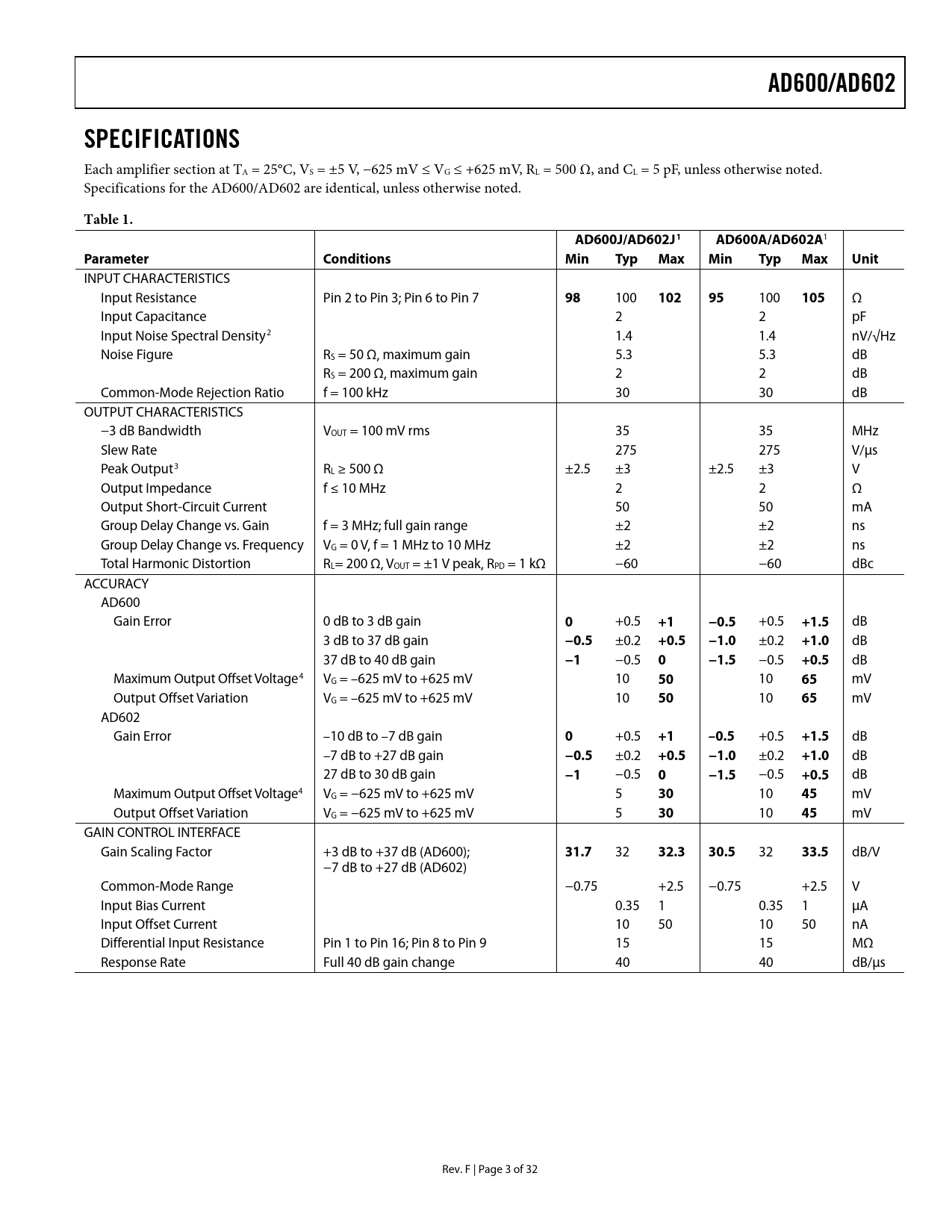 dB/V −7 dB to +27 dB (AD602) Common-Mode Range −0.75 +2.5 −0.75 +2.5 V Input Bias Current 0.35 1 0.35 1 μA Input Offset Current 10 50 10 50 nA Differential Input Resistance Pin 1 to Pin 16; Pin 8 to Pin 9 15 15 MΩ Response Rate Full 40 dB gain change 40 40 dB/μs Rev. F | Page 3 of 32 Document Outline FEATURES APPLICATIONS GENERAL DESCRIPTION FUNCTIONAL BLOCK DIAGRAM TABLE OF CONTENTS REVISION HISTORY SPECIFICATIONS ABSOLUTE MAXIMUM RATINGS ESD CAUTION PIN CONFIGURATION AND FUNCTION DESCRIPTIONS TYPICAL PERFORMANCE CHARACTERISTICS THEORY OF OPERATION NOISE PERFORMANCE GAIN-CONTROL INTERFACE SIGNAL-GATING INPUTS COMMON-MODE REJECTION ACHIEVING 80 dB GAIN RANGE SEQUENTIAL MODE (MAXIMUM SNR) PARALLEL MODE (SIMPLEST GAIN-CONTROL INTERFACE) LOW RIPPLE MODE (MINIMUM GAIN ERROR) APPLICATIONS INFORMATION TIME-GAIN CONTROL (TGC) AND TIME-VARIABLE GAIN (TVG) INCREASING OUTPUT DRIVE DRIVING CAPACITIVE LOADS REALIZING OTHER GAIN RANGES ULTRALOW NOISE VCA LOW NOISE, 6 dB PREAMPLIFIER LOW NOISE AGC AMPLIFIER WITH 80 dB GAIN RANGE WIDE RANGE, RMS-LINEAR dB MEASUREMENT SYSTEM (2 MHz AGC AMPLIFIER WITH RMS DETECTOR) 100 dB TO 120 dB RMS RESPONDING CONSTANT BANDWIDTH AGC SYSTEMS WITH HIGH ACCURACY DECIBEL OUTPUTS 100 dB RMS/AGC SYSTEM WITH MINIMAL GAIN ERROR (PARALLEL GAIN WITH OFFSET) 120 dB RMS/AGC SYSTEM WITH OPTIMAL SNR (SEQUENTIAL GAIN) OUTLINE DIMENSIONS ORDERING GUIDE