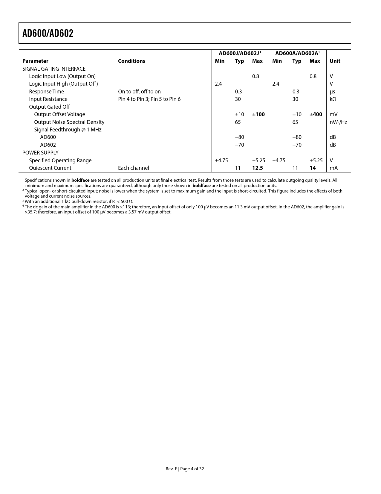 Pages / Page32 / 4 — AD600/AD602. AD600J/AD602J1. AD600A/AD602A. Parameter. Conditions. Min …