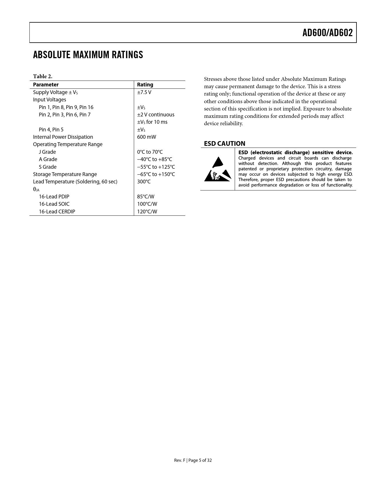 Pages / Page32 / 5 — AD600/AD602. ABSOLUTE MAXIMUM RATINGS. Table 2. Parameter Rating. ESD …