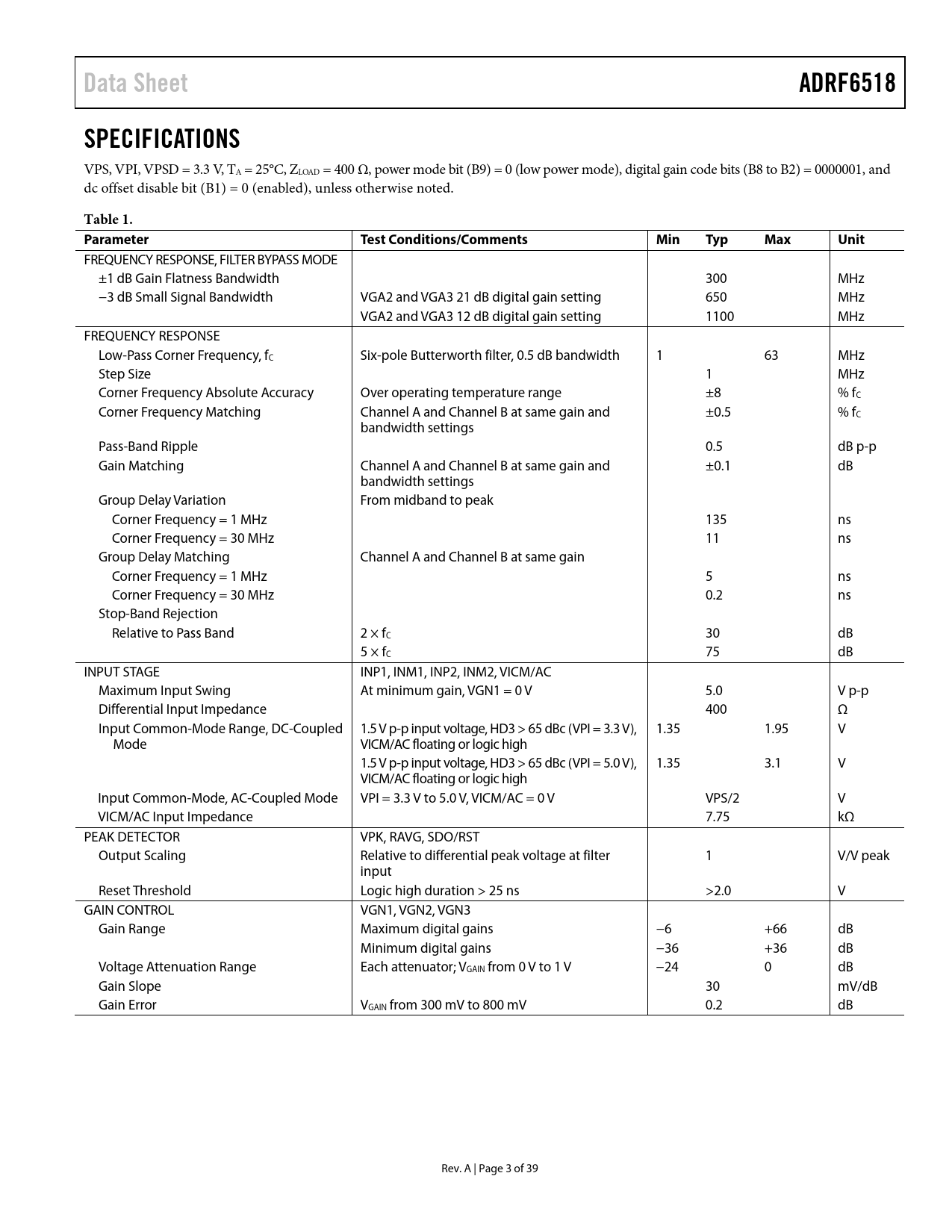 Pages / Page39 / 3 — Data Sheet. ADRF6518. SPECIFICATIONS. Table 1. Parameter. Test …