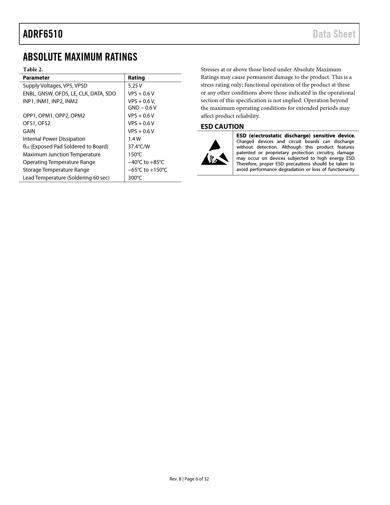 Pages / Page32 / 6 — ADRF6510. Data Sheet. ABSOLUTE MAXIMUM RATINGS Table 2. Parameter. …