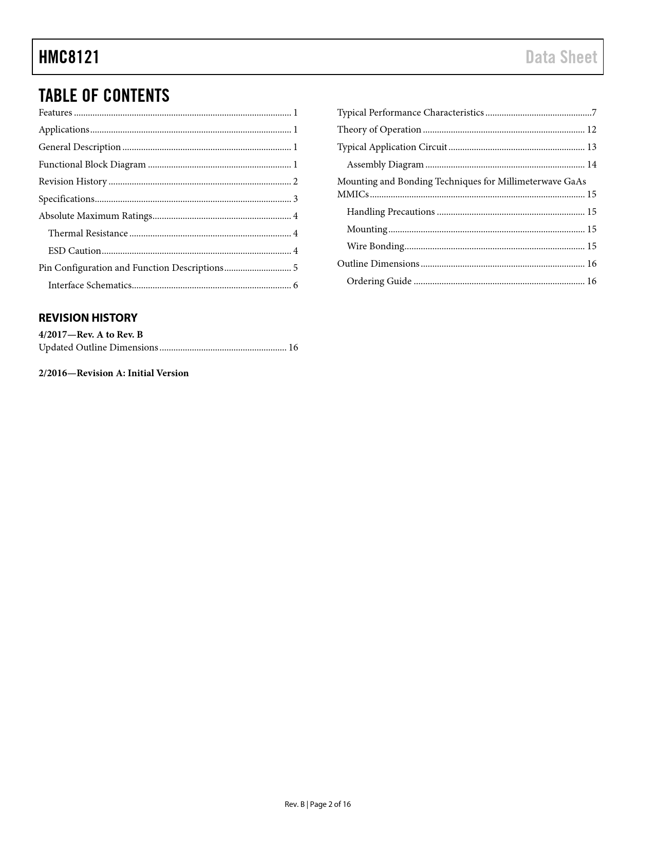 Pages / Page16 / 2 — HMC8121. Data Sheet. TABLE OF CONTENTS. REVISION HISTORY 4/2017—Rev. A to …