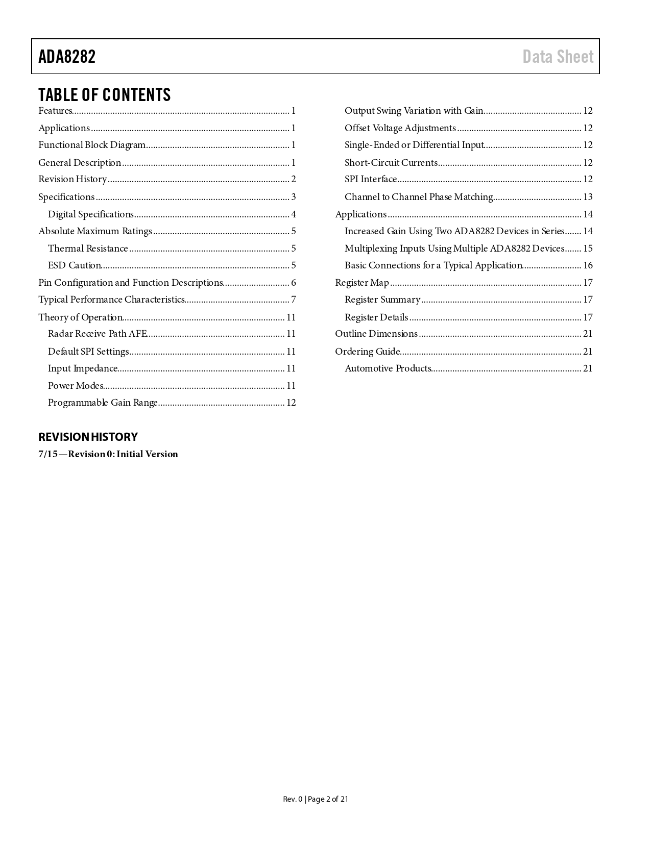 Pages / Page21 / 2 — ADA8282. Data Sheet. TABLE OF CONTENTS. REVISION HISTORY 7/15—Revision 0: …