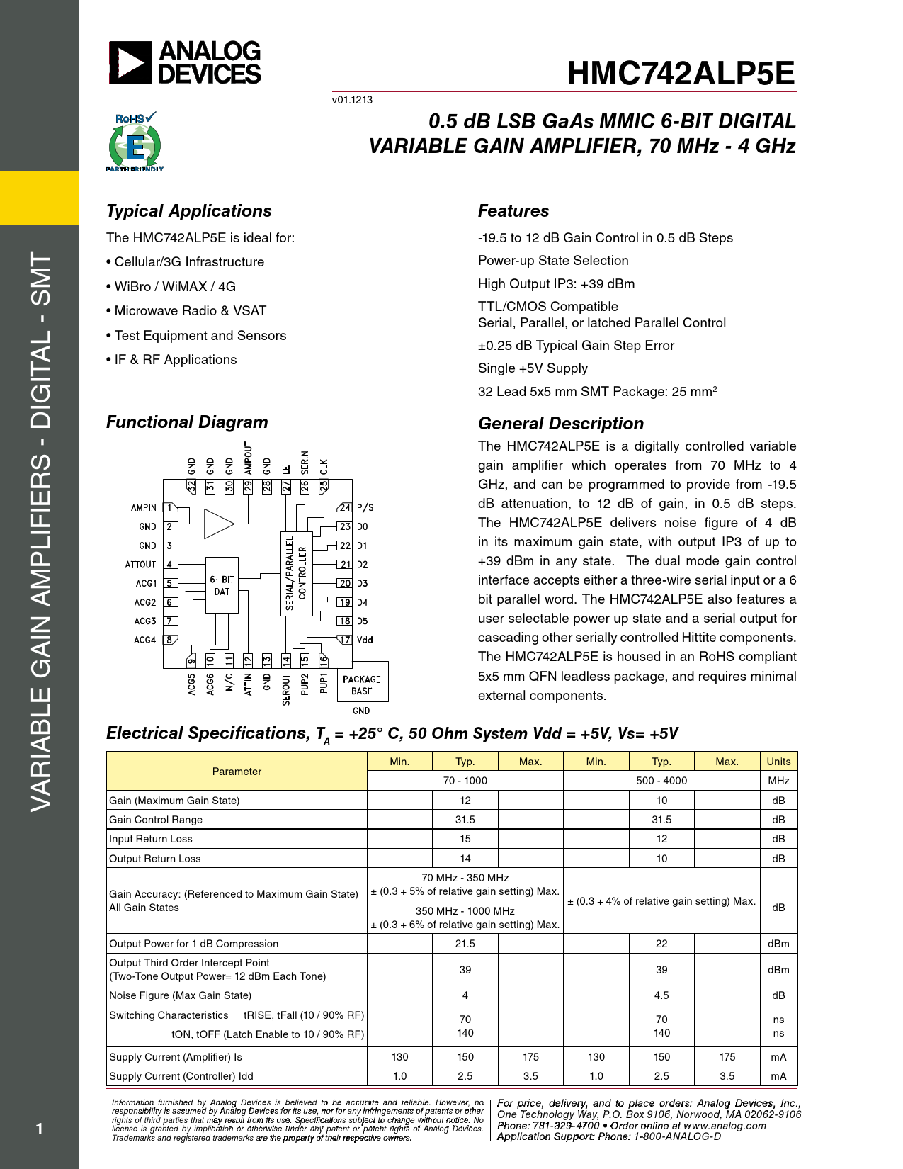 HMC742ALP5E. 0.5 dB LSB GaAs MMIC 6-BIT DIGITAL. VARIABLE GAIN AMPLIFIER, 70 MHz - 4 GHz. Typical Applications. Features