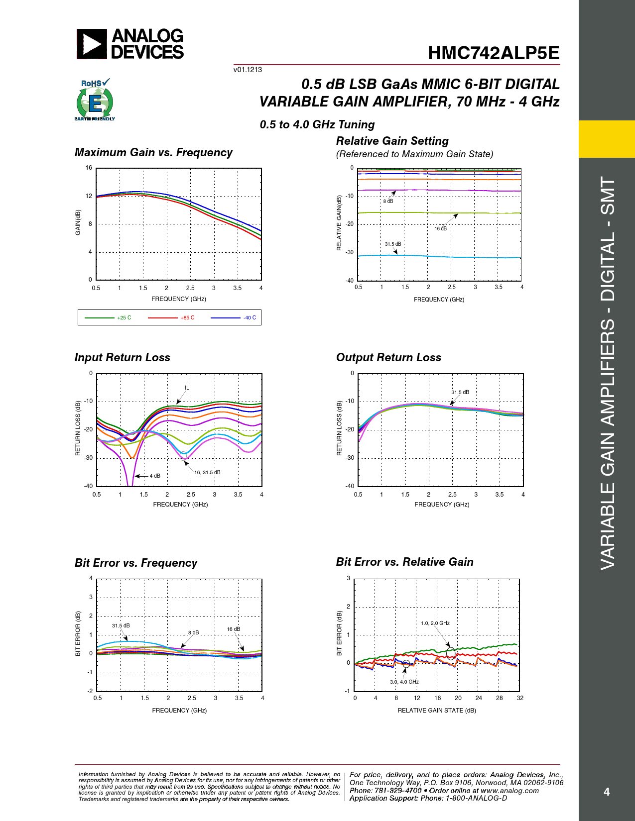 HMC742ALP5E. 0.5 dB LSB GaAs MMIC 6-BIT DIGITAL. VARIABLE GAIN AMPLIFIER, 70 MHz - 4 GHz. 0.5 to 4.0 GHz Tuning