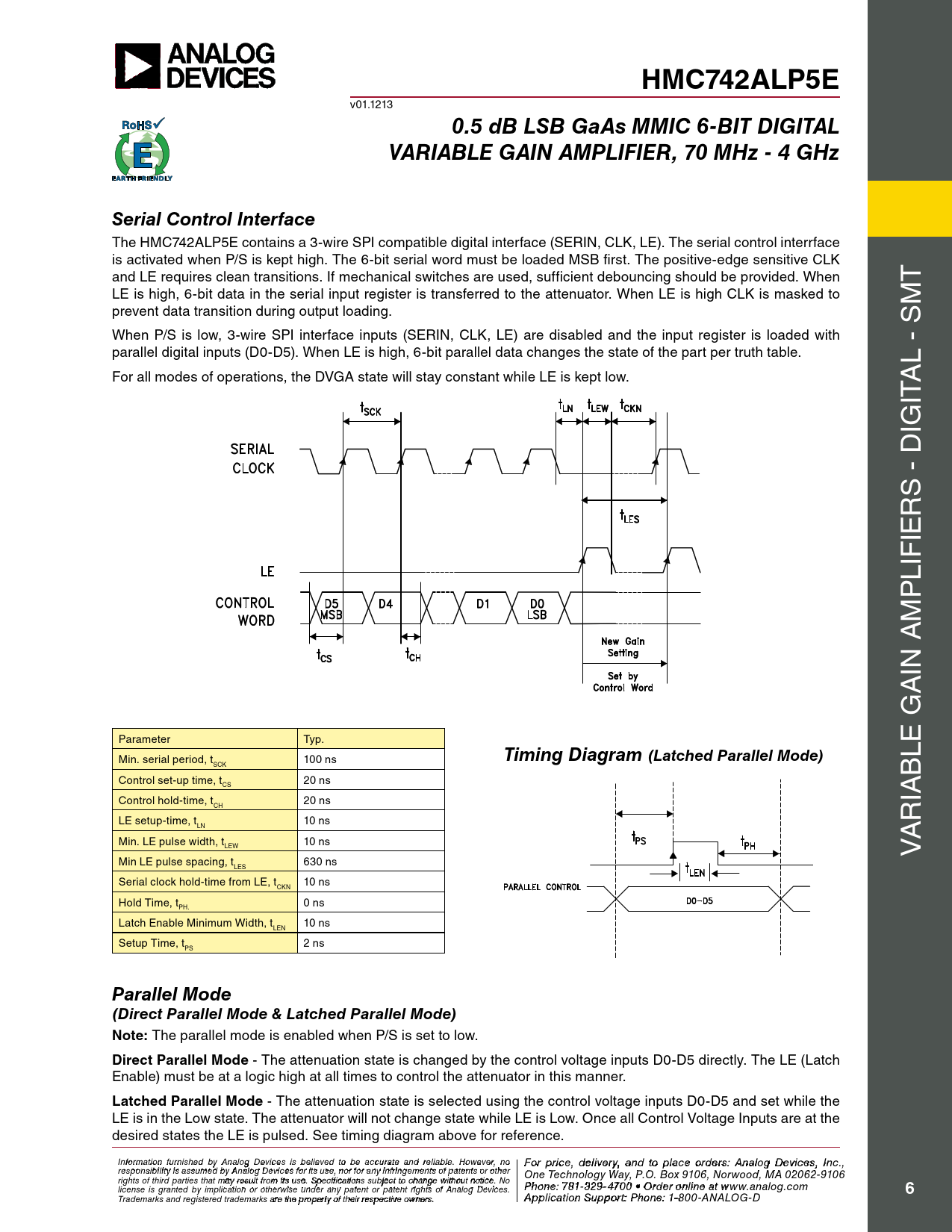 HMC742ALP5E v01.1213 0.5 dB LSB GaAs MMIC 6-BIT DIGITALVARIABLE GAIN AMPLIFIER, 70 MHz - 4 GHzSerial Control Interface The HMC742ALP5E contains a 3-wire SPI compatible digital interface (SERIN, CLK, LE). The serial control interrface is activated when P/S is kept high. The 6-bit serial word must be loaded MSB first. The positive-edge sensitive CLK and LE requires clean transitions. If mechanical switches are used, sufficient debouncing should be provided. When T LE is high, 6-bit data in the serial input register is transferred to the attenuator. When LE is high CLK is masked to M prevent data transition during output loading. When P/S is low, 3-wire SPI interface inputs (SERIN, CLK, LE) are disabled and the input register is loaded with paral el digital inputs (D0-D5). When LE is high, 6-bit paral el data changes the state of the part per truth table. L - S For all modes of operations, the DVGA state will stay constant while LE is kept low. ITA IG S - D R IE LIF P M IN A A Parameter Typ. Min. serial period, t 100 ns Timing Diagram (Latched Parallel Mode) LE G SCK B Control set-up time, t 20 ns CS Control hold-time, t 20 ns IA CH LE setup-time, t 10 ns R LN Min. LE pulse width, t 10 ns A LEW V Min LE pulse spacing, t 630 ns LES Serial clock hold-time from LE, t 10 ns CKN Hold Time, t 0 ns PH. Latch Enable Minimum Width, t 10 ns LEN Setup Time, t 2 ns PS Parallel Mode(Direct Parallel Mode & Latched Parallel Mode)Note: The paral el mode is enabled when P/S is set to low. Direct Parallel Mode - The attenuation state is changed by the control voltage inputs D0-D5 directly. The LE (Latch Enable) must be at a logic high at all times to control the attenuator in this manner. Latched Parallel Mode - The attenuation state is selected using the control voltage inputs D0-D5 and set while the LE is in the Low state. The attenuator will not change state while LE is Low. Once all Control Voltage Inputs are at the desired states the LE is pulsed. See timing diagram above for reference. I F nf o or r p mati r o in cfe ur , d nish e e l d iv b e y r A y a nalo n g d t Devi o p ces i la s c bele o ieve rd d t e o rbs e : H acc iutrtatite e M and ic reli rao bl w e. a H v o e C wever o , nrp o For price, delivery, and to place orders: Analog Devices, Inc., responsibility is assumed by Analog Devices for its use, nor for any infringements of patents or other oration, 2 Elizabeth Drive, Chelmsford, MA 01824 One Technology Way, P.O. Box 9106, Norwood, MA 02062-9106 Phone: 978-250-3343 Fax: 978-250-3373 O rights of third parties that may result from its use. Specifications subject to change without notice. No rd Phoe n r O e: 7 n- 81-li 3 n 2 e a 9-4 t w 70 ww 0 • O . rdh e itt r o it nle i . n co e a m license is granted by implication or otherwise under any patent or patent rights of Analog Devices. t www.analog.com 6 Application Support: Phon Trademarks and registered trademarks are the property of their respective owners. e: 978-250-334 A 3 o pplic r a atio pp n S s u @ p h por ittti : Pte ho.c n o e m : 1-800-ANALOG-D