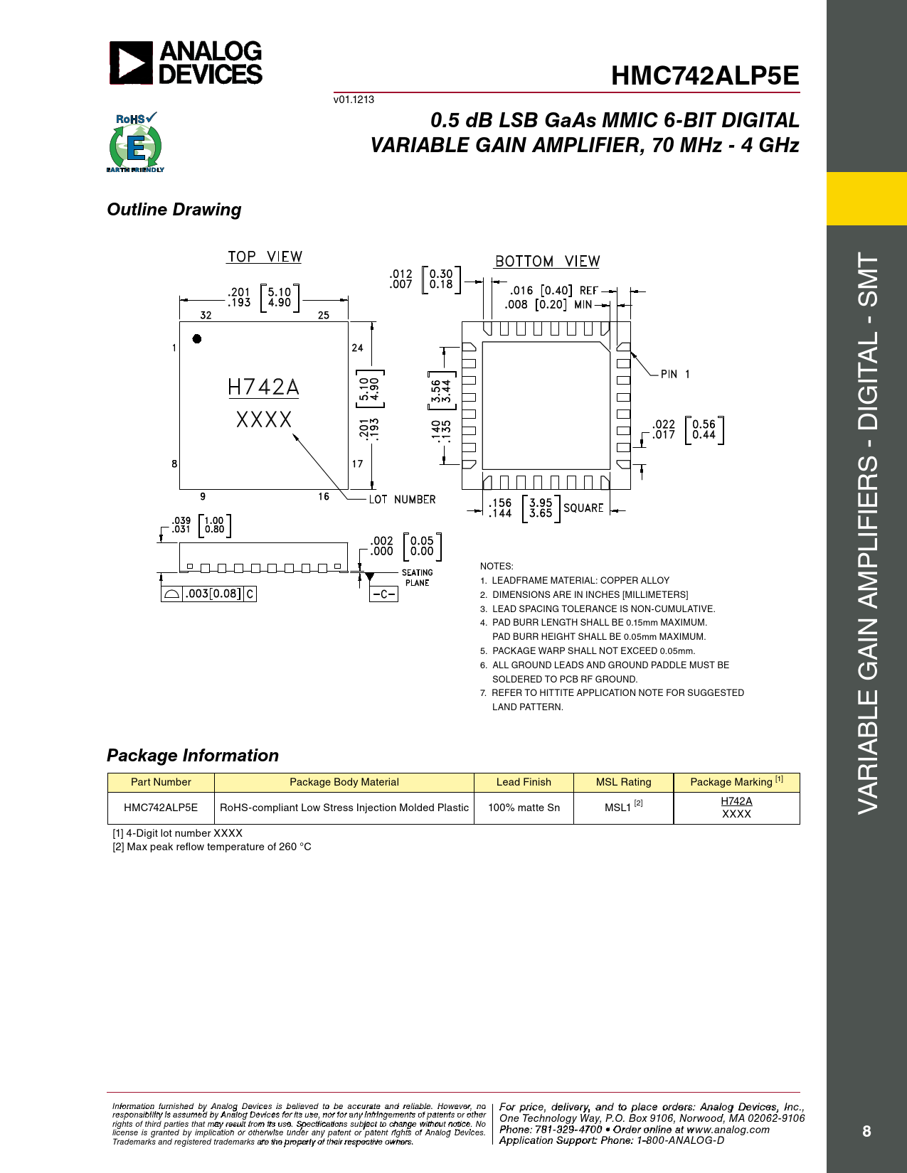 HMC742ALP5E. 0.5 dB LSB GaAs MMIC 6-BIT DIGITAL. VARIABLE GAIN AMPLIFIER, 70 MHz - 4 GHz. Outline Drawing. Package Information