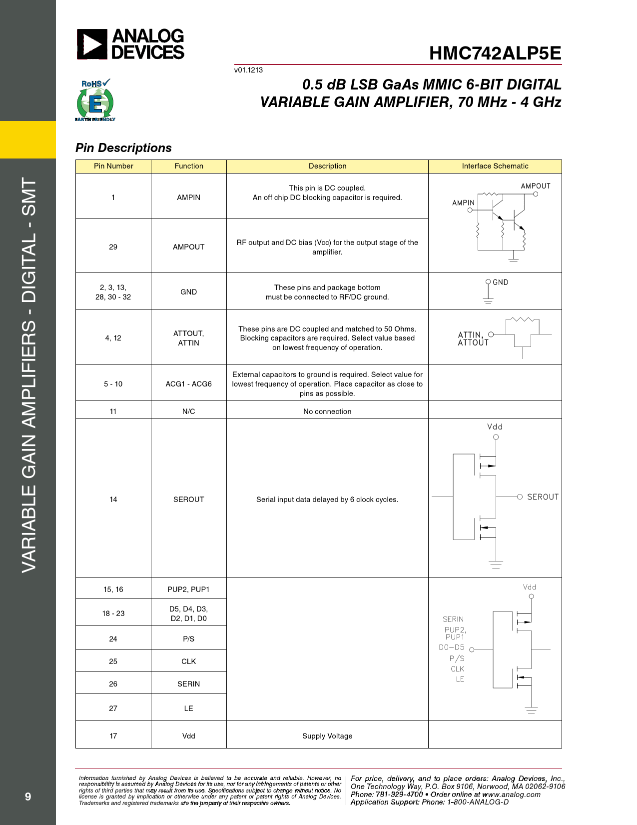 HMC742ALP5E. 0.5 dB LSB GaAs MMIC 6-BIT DIGITAL. VARIABLE GAIN AMPLIFIER, 70 MHz - 4 GHz. Pin Descriptions
