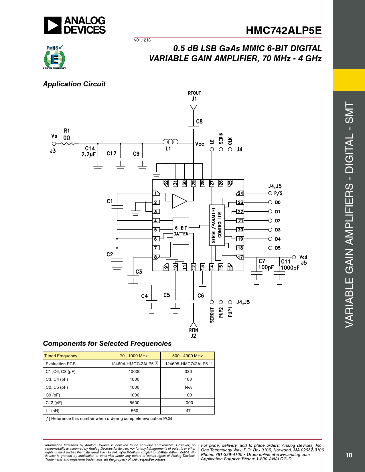 HMC742ALP5E v01.1213 0.5 dB LSB GaAs MMIC 6-BIT DIGITALVARIABLE GAIN AMPLIFIER, 70 MHz - 4 GHzApplication Circuit T M L - S ITA IG S - D R IE LIF P M IN A A LE G B IA R A V Components for Selected Frequencies Tuned Frequency 70 - 1000 MHz 500 - 4000 MHz Evaluation PCB 124694-HMC742ALP5 [1] 124695-HMC742ALP5 1] C1 ,C6, C8 (pF) 10000 330 C3, C4 (pF) 1000 100 C2, C5 (pF) 1000 N/A C9 (pF) 1000 100 C12 (pF) 5600 1000 L1 (nH) 560 47 [1] Reference this number when ordering complete evaluation PCB I F nf o or r p mati r o in cfe ur , d nish e e l d iv b e y r A y a nalo n g d t Devi o p ces i la s c bele o ieve rd d t e o rbs e : H acc iutrtatite e M and ic reli rao bl w e. a H v o e C wever o , nrp o For price, delivery, and to place orders: Analog Devices, Inc., responsibility is assumed by Analog Devices for its use, nor for any infringements of patents or other oration, 2 Elizabeth Drive, Chelmsford, MA 01824 One Technology Way, P.O. Box 9106, Norwood, MA 02062-9106 Phone: 978-250-3343 Fax: 978-250-3373 O rights of third parties that may result from its use. Specifications subject to change without notice. No rd Phoe n r O e: 7 n- 81-li 3 n 2 e a 9-4 t w 70 ww 0 • O . rdh e itt r o it nle i . n co e a m license is granted by implication or otherwise under any patent or patent rights of Analog Devices. t www.analog.com 10 Application Support: Phon Trademarks and registered trademarks are the property of their respective owners. e: 978-250-334 A 3 o pplic r a atio pp n S s u @ p h por ittti : Pte ho.c n o e m : 1-800-ANALOG-D