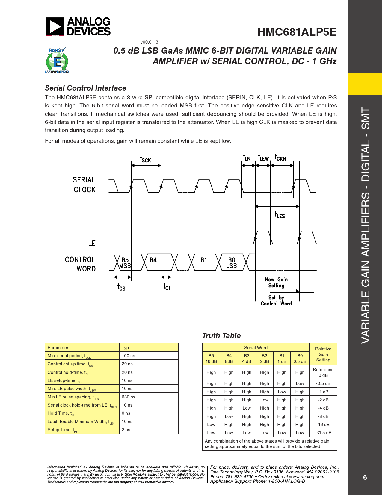HMC681ALP5E v00.0113 0.5 dB LSB GaAs MMIC 6-BIT DIGITAL VARIABLE GAINAMPLIFIER w/ SERIAL CONTROL, DC - 1 GHzSerial Control Interface The HMC681ALP5E contains a 3-wire SPI compatible digital interface (SERIN, CLK, LE). It is activated when P/S is kept high. The 6-bit serial word must be loaded MSB first. The positive-edge sensitive CLK and LE requires clean transitions. If mechanical switches were used, sufficient debouncing should be provided. When LE is high, T 6-bit data in the serial input register is transferred to the attenuator. When LE is high CLK is masked to prevent data M transition during output loading. For all modes of operations, gain will remain constant while LE is kept low. L - S ITA IG S - D R IE LIF P M IN A A LE G B IA R Truth Table A V Parameter Typ. Serial Word Relative Gain Min. serial period, t 100 ns B5 B4 B3 B2 B1 B0 SCK Setting 16 dB 8dB 4 dB 2 dB 1 dB 0.5 dB Control set-up time, t 20 ns CS Reference Control hold-time, t 20 ns High High High High High High CH 0 dB LE setup-time, t 10 ns LN High High High High High Low -0.5 dB Min. LE pulse width, t 10 ns LEW High High High High Low High -1 dB Min LE pulse spacing, t 630 ns LES High High High Low High High -2 dB Serial clock hold-time from LE, t 10 ns CKN High High Low High High High -4 dB Hold Time, t 0 ns PH. High Low High High High High -8 dB Latch Enable Minimum Width, t 10 ns LEN Low High High High High High -16 dB Setup Time, t 2 ns PS Low Low Low Low Low Low -31.5 dB Any combination of the above states will provide a relative gain setting approximately equal to the sum of the bits selected. I F nf o or r p mati r o in cfe ur , d nish e e l d iv b e y r A y a nalo n g d t Devi o p ces i la s c bele o ieve rd d t e o rbs e : H acc iutrtatite e M and ic reli rao bl w e. a H v o e C wever o , nrp o For price, delivery, and to place orders: Analog Devices, Inc., responsibility is assumed by Analog Devices for its use, nor for any infringements of patents or other oration, 2 Elizabeth Drive, Chelmsford, MA 01824 One Technology Way, P.O. Box 9106, Norwood, MA 02062-9106 Phone: 978-250-3343 Fax: 978-250-3373 O rights of third parties that may result from its use. Specifications subject to change without notice. No rd Phoe n r O e: 7 n- 81-li 3 n 2 e a 9-4 t w 70 ww 0 • O . rdh e itt r o it nle i . n co e a m license is granted by implication or otherwise under any patent or patent rights of Analog Devices. t www.analog.com 6 Application Support: Phon Trademarks and registered trademarks are the property of their respective owners. e: 978-250-334 A 3 o pplic r a atio pp n S s u @ p h por ittti : Pte. ho c n o e m : 1-800-ANALOG-D