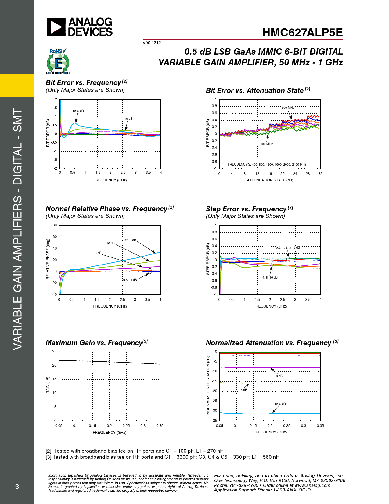 HMC627ALP5E v00.1212 0.5 dB LSB GaAs MMIC 6-BIT DIGITALVARIABLE GAIN AMPLIFIER, 50 MHz - 1 GHzBit Error vs. Frequency [2] (Only Major States are Shown) Bit Error vs. Attenuation State [2] 2 1 T 0.8 1.5 800 MHz 31.5 dB 0.6 M 1 ) 16 dB ) B 0.4 B d d ( 0.5 ( R 0.2 R O O R 0 R 0 R R L - S E E -0.2 -0.5 IT IT B 400 MHz B -0.4 -1 ITA -0.6 -1.5 -0.8 FREQUENCY'S: 400, 800, 1200, 1600, 2000, 2400 MHz IG -2 -1 0 0.5 1 1.5 2 2.5 3 3.5 4 0 4 8 12 16 20 24 28 32 FREQUENCY (GHz) ATTENUATION STATE (dB) S - D R Normal Relative Phase vs. Frequency [2]Step Error vs. Frequency [2] IE (Only Major States are Shown) (Only Major States are Shown) 80 1 LIF 0.8 P 60 ) g 31.5 dB 0.6 e 16 dB M (d B) 0.4 40 0.5, 1, 2, 31.5 dB (d R ASE 8 dB 0.2 O PH R 20 0 ER IN A IVE -0.2 EP AT 0 A ST -0.4 EL R 4, 8, 16 dB 0.5 - 4 dB -0.6 -20 -0.8 -40 -1 LE G 0 0.5 1 1.5 2 2.5 3 3.5 4 0 0.5 1 1.5 2 2.5 3 3.5 4 FREQUENCY (GHz) FREQUENCY (GHz) B IA R A V Maximum Gain vs. Frequency[3]Normalized Attenuation vs. Frequency [3] 25 0 ) B (d -5 20 N IO T -10 ) UA 8 dB B 15 N d E -15 ( T IN T A A 16 dB G -20 10 D E IZ L -25 A 31.5 dB 5 RM -30 NO 0 -35 0.05 0.1 0.15 0.2 0.25 0.3 0.35 0.05 0.1 0.15 0.2 0.25 0.3 0.35 FREQUENCY (GHz) FREQUENCY (GHz) [2] Tested with broadband bias tee on RF ports and C1 = 100 pF, L1 = 270 nF [3] Tested with broadband bias tee on RF ports and C1 = 3300 pF; C3, C4 & C5 = 330 pF; L1 = 560 nH I F nf o or r p mati r o in cfe ur , d nish e e l d iv b e y r A y a nalo n g d t Devi o p ces i la s c bele o ieve rd d t e o rbs e : H acc iutrtatite e M and ic reli rao bl w e. a H v o e C wever o , nrp o For price, delivery, and to place orders: Analog Devices, Inc., responsibility is assumed by Analog Devices for its use, nor for any infringements of patents or other oration, 2 Elizabeth Drive, Chelmsford, MA 01824 One Technology Way, P.O. Box 9106, Norwood, MA 02062-9106 Phone: 978-250-3343 Fax: 978-250-3373 O rights of third parties that may result from its use. Specifications subject to change without notice. No rd Phoe n r O e: 7 n- 81-li 3 n 2 e a 9-4 t w 70 ww 0 • O . rdh e itt r o it nle i . n co e a m 3 license is granted by implication or otherwise under any patent or patent rights of Analog Devices. t www.analog.com Application Support: Phon Trademarks and registered trademarks are the property of their respective owners. e: 978-250-334 A 3 o pplic r a atio pp n S s u @ p h por ittti : Pte ho.c n o e m : 1-800-ANALOG-D