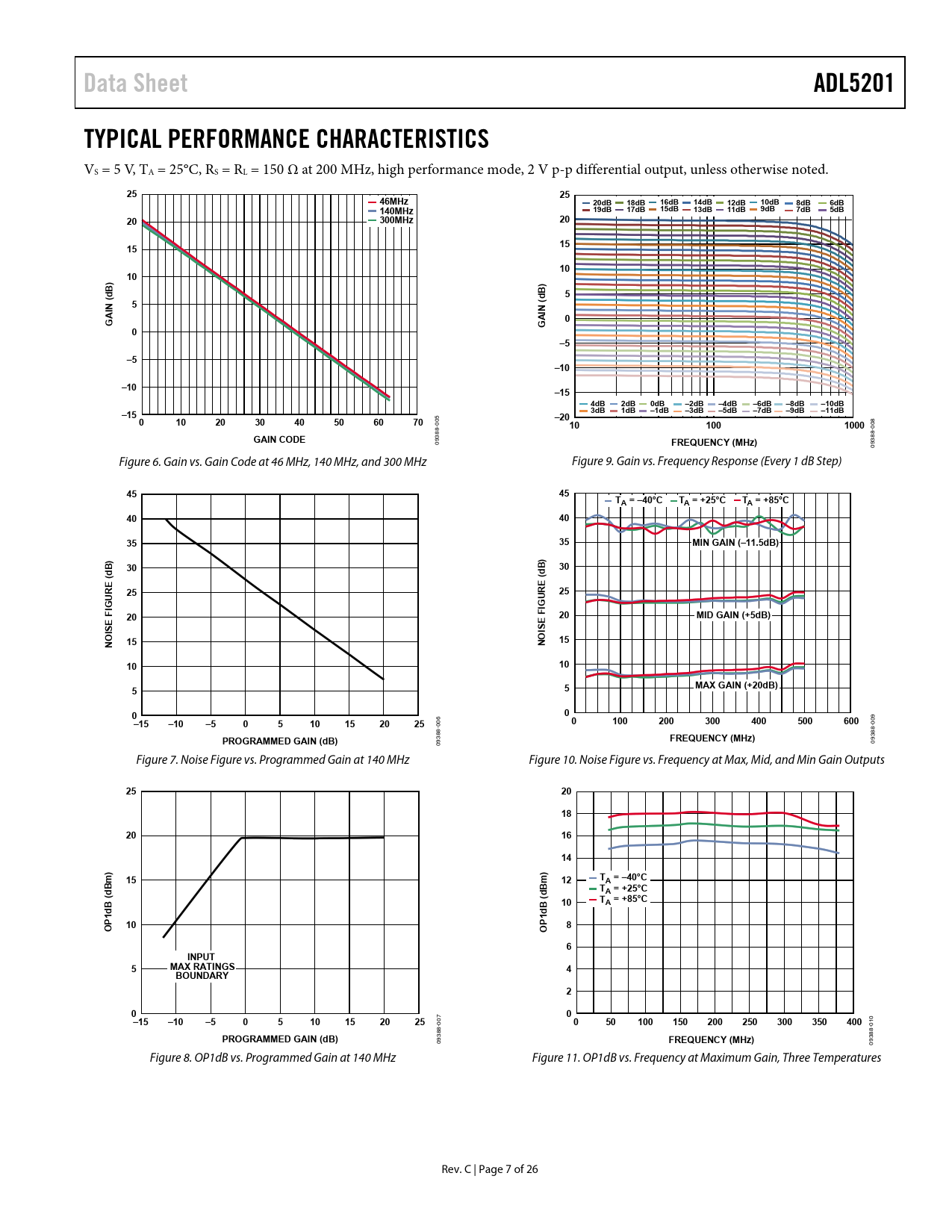 Data SheetADL5201TYPICAL PERFORMANCE CHARACTERISTICS VS = 5 V, TA = 25°C, RS = RL = 150 Ω at 200 MHz, high performance mode, 2 V p-p differential output, unless otherwise noted. 252546MHz20dB18dB16dB14dB12dB10dB8dB6dB140MHz19dB17dB15dB13dB11dB9dB7dB5dB20300MHz2015151010))B dB5(d5(ININGA0GA0–5–5–10–10–154dB2dB0dB–2dB–4dB–6dB–8dB–10dB–153dB1dB–1dB–3dB–5dB–7dB–9dB–11dB–20010203040506070 005 101001000 08-0 GAIN CODE 388- 388 09 FREQUENCY (MHz) 09 Figure 6. Gain vs. Gain Code at 46 MHz, 140 MHz, and 300 MHz Figure 9. Gain vs. Frequency Response (Every 1 dB Step) 4545TA = –40°C TA = +25°C TA = +85°C40403535MIN GAIN (–11.5dB))B)30B30dd((25RE25UREUIGIGF20F20MID GAIN (+5dB)EEISIS15NO15NO1010MAX GAIN (+20dB)5500–15–10–505101520250100200300400500600 006 009 PROGRAMMED GAIN (dB)FREQUENCY (MHz) 09388- 09388- Figure 7. Noise Figure vs. Programmed Gain at 140 MHz Figure 10. Noise Figure vs. Frequency at Max, Mid, and Min Gain Outputs 252018201614)15m12TA = –40°CBm)BddTA = +25°C(TB (10BA = +85°C1ddP10O8OP16INPUT5MAX RATINGS4BOUNDARY200–15–10–50510152025 07 050100150200250300350400 10 -0 -0 PROGRAMMED GAIN (dB) 388 388 09 FREQUENCY (MHz) 09 Figure 8. OP1dB vs. Programmed Gain at 140 MHz Figure 11. OP1dB vs. Frequency at Maximum Gain, Three Temperatures Rev. C | Page 7 of 26 Document Outline FEATURES APPLICATIONS FUNCTIONAL BLOCK DIAGRAM GENERAL DESCRIPTION TABLE OF CONTENTS REVISION HISTORY SPECIFICATIONS TIMING DIAGRAMS ABSOLUTE MAXIMUM RATINGS ESD CAUTION PIN CONFIGURATION AND FUNCTION DESCRIPTIONS TYPICAL PERFORMANCE CHARACTERISTICS CHARACTERIZATION AND TEST CIRCUITS THEORY OF OPERATION DIGITAL INTERFACE OVERVIEW PARALLEL DIGITAL INTERFACE SERIAL PERIPHERAL INTERFACE (SPI) Fast Attack UP/DOWN INTERFACE Truth Table LOGIC TIMING CIRCUIT DESCRIPTION BASIC STRUCTURE INPUT SYSTEM OUTPUT AMPLIFIER GAIN CONTROL APPLICATIONS INFORMATION BASIC CONNECTIONS ADC DRIVING LAYOUT CONSIDERATIONS EVALUATION BOARD EVALUATION BOARD CONTROL SOFTWARE SCHEMATICS AND ARTWORK EVALUATION BOARD CONFIGURATION OPTIONS Configuration Options for the Main Section Configuration Options for the USB Section OUTLINE DIMENSIONS ORDERING GUIDE