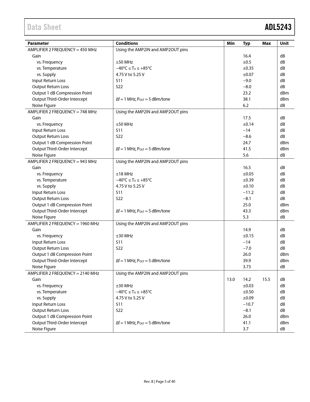 AMPLIFIER 2 FREQUENCY = 450 MHz Using the AMP2IN and AMP2OUT pins Gain 16.4 dB vs. Frequency ±50 MHz ±0.5 dB vs. Temperature −40°C ≤ TA ≤ +85°C ±0.35 dB vs. Supply 4.75 V to 5.25 V ±0.07 dB Input Return Loss S11 −9.0 dB Output Return Loss S22 −8.0 dB Output 1 dB Compression Point 23.2 dBm Output Third-Order Intercept ∆f = 1 MHz, POUT = 5 dBm/tone 38.1 dBm Noise Figure 6.2 dB AMPLIFIER 2 FREQUENCY = 748 MHz Using the AMP2IN and AMP2OUT pins Gain 17.5 dB vs. Frequency ±50 MHz ±0.14 dB Input Return Loss S11 −14 dB Output Return Loss S22 −8.6 dB Output 1 dB Compression Point 24.7 dBm Output Third-Order Intercept ∆f = 1 MHz, POUT = 5 dBm/tone 41.5 dBm Noise Figure 5.6 dB AMPLIFIER 2 FREQUENCY = 943 MHz Using the AMP2IN and AMP2OUT pins Gain 16.5 dB vs. Frequency ±18 MHz ±0.05 dB vs. Temperature −40°C ≤ TA ≤ +85°C ±0.39 dB vs. Supply 4.75 V to 5.25 V ±0.10 dB Input Return Loss S11 −11.2 dB Output Return Loss S22 −8.1 dB Output 1 dB Compression Point 25.0 dBm Output Third-Order Intercept ∆f = 1 MHz, POUT = 5 dBm/tone 43.3 dBm Noise Figure 5.3 dB AMPLIFIER 2 FREQUENCY = 1960 MHz Using the AMP2IN and AMP2OUT pins Gain 14.9 dB vs. Frequency ±30 MHz ±0.15 dB Input Return Loss S11 −14 dB Output Return Loss S22 −7.0 dB Output 1 dB Compression Point 26.0 dBm Output Third-Order Intercept ∆f = 1 MHz, POUT = 5 dBm/tone 39.9 dBm Noise Figure 3.73 dB AMPLIFIER 2 FREQUENCY = 2140 MHz Using the AMP2IN and AMP2OUT pins Gain 13.0 14.2 15.5 dB vs. Frequency ±30 MHz ±0.03 dB vs. Temperature −40°C ≤ TA ≤ +85°C ±0.50 dB vs. Supply 4.75 V to 5.25 V ±0.09 dB Input Return Loss S11 −10.7 dB Output Return Loss S22 −8.1 dB Output 1 dB Compression Point 26.0 dBm Output Third-Order Intercept ∆f = 1 MHz, POUT = 5 dBm/tone 41.1 dBm Noise Figure 3.7 dB Rev. B | Page 5 of 40 Document Outline Features Applications General Description Functional Block Diagram Revision History Specifications Absolute Maximum Ratings ESD Caution Pin Configuration and Function Descriptions Typical Performance Characteristics Applications Information Basic Layout Connections Amplifier 1 Power Supply Amplifier 1 RF Input Interface Amplifier 1 RF Output Interface Amplifier 2 Power Supply Amplifier 2 RF Input Interface Amplifier 2 RF Output Interface DSA RF Input Interface DSA RF Output Interface DSA SPI Interface SPI Timing SPI Timing Sequence ADL5243 Amplifier 2 Matching ADL5243 Loop Performance Proper Driving Level for the Optimum ACLR Thermal Considerations Soldering Information and Recommended PCB Land Pattern Evaluation Board Outline Dimensions Ordering Guide