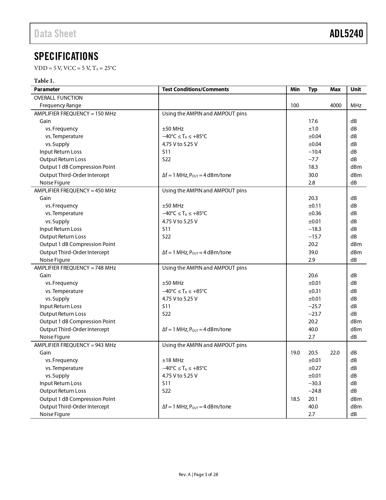 Pages / Page28 / 3 — Data Sheet. ADL5240. SPECIFICATIONS. Table 1. Parameter. Test …