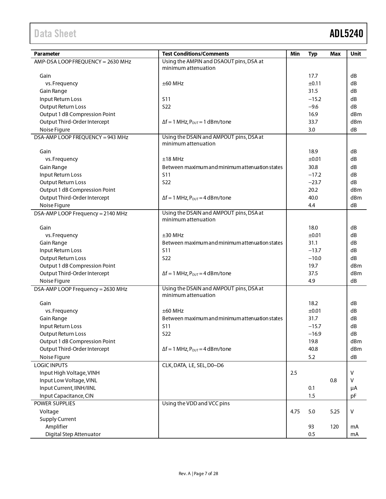 Data SheetADL5240ParameterTest Conditions/CommentsMinTypMaxUnit AMP-DSA LOOP FREQUENCY = 2630 MHz Using the AMPIN and DSAOUT pins, DSA at minimum attenuation Gain 17.7 dB vs. Frequency ±60 MHz ±0.11 dB Gain Range 31.5 dB Input Return Loss S11 −15.2 dB Output Return Loss S22 −9.6 dB Output 1 dB Compression Point 16.9 dBm Output Third-Order Intercept ∆f = 1 MHz, POUT = 1 dBm/tone 33.7 dBm Noise Figure 3.0 dB DSA-AMP LOOP FREQUENCY = 943 MHz Using the DSAIN and AMPOUT pins, DSA at minimum attenuation Gain 18.9 dB vs. Frequency ±18 MHz ±0.01 dB Gain Range Between maximum and minimum attenuation states 30.8 dB Input Return Loss S11 −17.2 dB Output Return Loss S22 −23.7 dB Output 1 dB Compression Point 20.2 dBm Output Third-Order Intercept ∆f = 1 MHz, POUT = 4 dBm/tone 40.0 dBm Noise Figure 4.4 dB DSA-AMP LOOP Frequency = 2140 MHz Using the DSAIN and AMPOUT pins, DSA at minimum attenuation Gain 18.0 dB vs. Frequency ±30 MHz ±0.01 dB Gain Range Between maximum and minimum attenuation states 31.1 dB Input Return Loss S11 −13.7 dB Output Return Loss S22 −10.0 dB Output 1 dB Compression Point 19.7 dBm Output Third-Order Intercept ∆f = 1 MHz, POUT = 4 dBm/tone 37.5 dBm Noise Figure 4.9 dB DSA-AMP LOOP Frequency = 2630 MHz Using the DSAIN and AMPOUT pins, DSA at minimum attenuation Gain 18.2 dB vs. Frequency ±60 MHz ±0.01 dB Gain Range Between maximum and minimum attenuation states 31.7 dB Input Return Loss S11 −15.7 dB Output Return Loss S22 −16.9 dB Output 1 dB Compression Point 19.8 dBm Output Third-Order Intercept ∆f = 1 MHz, POUT = 4 dBm/tone 40.8 dBm Noise Figure 5.2 dB LOGIC INPUTS CLK, DATA, LE, SEL, D0~D6 Input High Voltage, VINH 2.5 V Input Low Voltage, VINL 0.8 V Input Current, IINH/IINL 0.1 µA Input Capacitance, CIN 1.5 pF POWER SUPPLIES Using the VDD and VCC pins Voltage 4.75 5.0 5.25 V Supply Current Amplifier 93 120 mA Digital Step Attenuator 0.5 mA Rev. A | Page 7 of 28 Document Outline Features Applications General Description Functional Block Diagram Revision History Specifications Absolute Maximum Ratings ESD Caution Pin Configuration and Function Descriptions Typical Performance Characteristics Applications Information Basic Layout Connections Amplifier Bias Digital Step Attenuator Bias Amplifier RF Input Interface Amplifier RF Output Interface DSA RF Input Interface DSA RF Output Interface DSA SPI Interface SPI Timing SPI Timing Sequence Loop Performance Amplifier Drive Level for Optimum ACLR Thermal Considerations Evaluation Board Outline Dimensions Ordering Guide