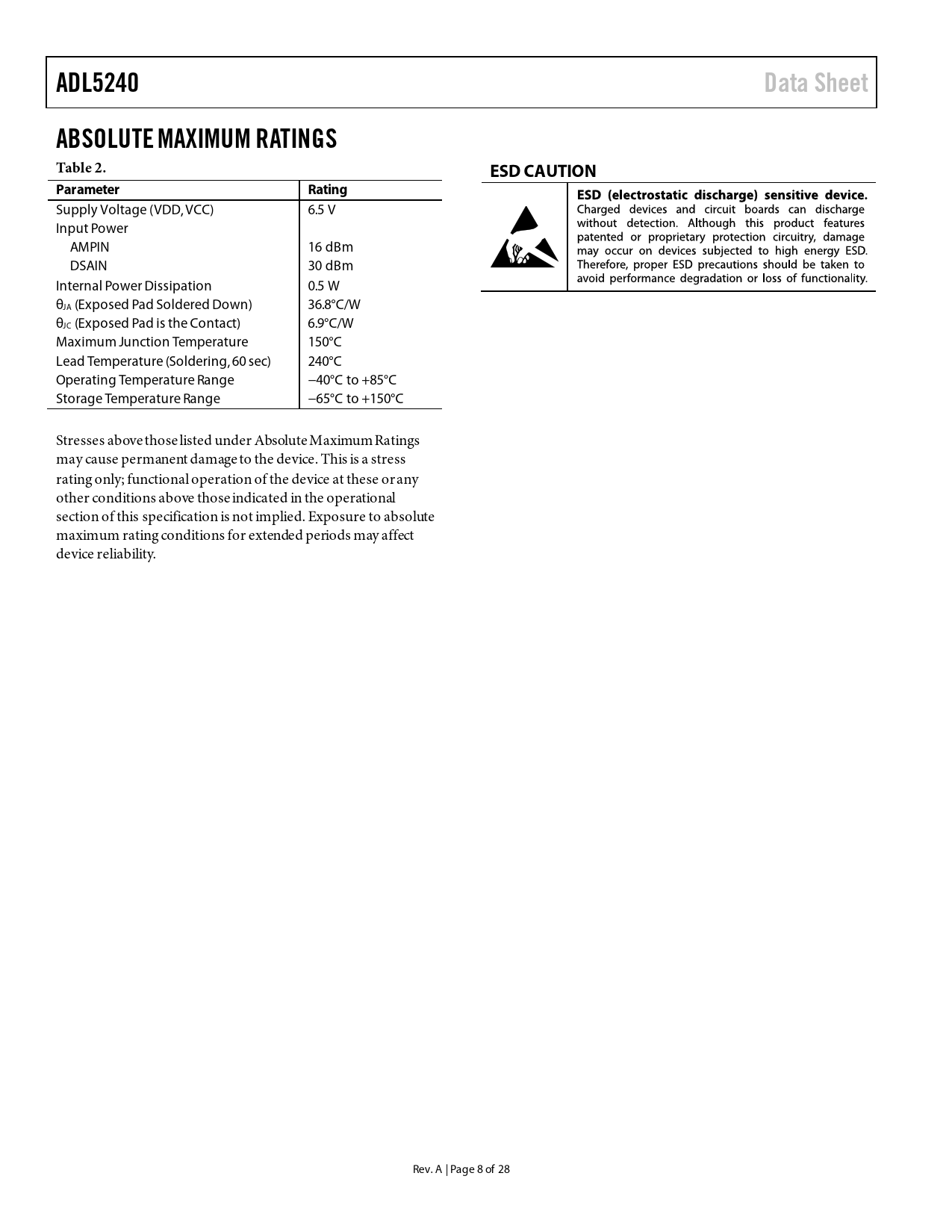 ADL5240Data SheetABSOLUTE MAXIMUM RATINGSTable 2.ESD CAUTIONParameterRating Supply Voltage (VDD, VCC) 6.5 V Input Power AMPIN 16 dBm DSAIN 30 dBm Internal Power Dissipation 0.5 W θJA (Exposed Pad Soldered Down) 36.8°C/W θJC (Exposed Pad is the Contact) 6.9°C/W Maximum Junction Temperature 150°C Lead Temperature (Soldering, 60 sec) 240°C Operating Temperature Range −40°C to +85°C Storage Temperature Range −65°C to +150°C Stresses above those listed under Absolute Maximum Ratings may cause permanent damage to the device. This is a stress rating only; functional operation of the device at these or any other conditions above those indicated in the operational section of this specification is not implied. Exposure to absolute maximum rating conditions for extended periods may affect device reliability. Rev. A | Page 8 of 28 Document Outline Features Applications General Description Functional Block Diagram Revision History Specifications Absolute Maximum Ratings ESD Caution Pin Configuration and Function Descriptions Typical Performance Characteristics Applications Information Basic Layout Connections Amplifier Bias Digital Step Attenuator Bias Amplifier RF Input Interface Amplifier RF Output Interface DSA RF Input Interface DSA RF Output Interface DSA SPI Interface SPI Timing SPI Timing Sequence Loop Performance Amplifier Drive Level for Optimum ACLR Thermal Considerations Evaluation Board Outline Dimensions Ordering Guide