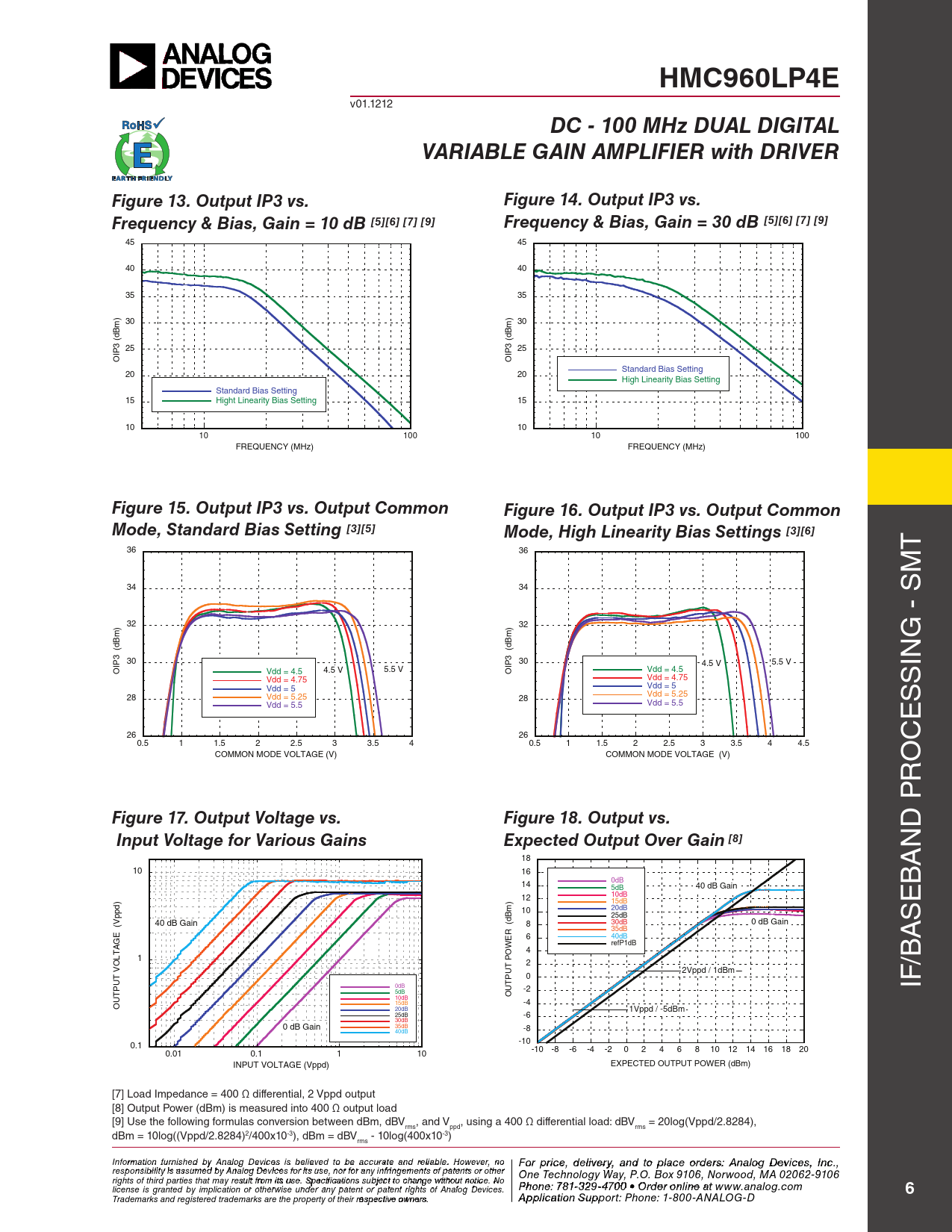 HMC960LP4E v01.1212 DC - 100 MHz DUAL DigitALVAriAbLe gAin AMpLifier with DriVerfigure 13. Output ip3 vs.figure 14. Output ip3 vs.frequency & bias, gain = 10 db [5][6] [7] [9]frequency & bias, gain = 30 db [5][6] [7] [9] 45 45 40 40 35 35 ) 30 ) 30 Bm Bm (d (d 25 25 IP3 IP3 O O Standard Bias Setting 20 20 High Linearity Bias Setting Standard Bias Setting 15 Hight Linearity Bias Setting 15 10 10 10 100 10 100 FREQUENCY (MHz) FREQUENCY (MHz) figure 15. Output ip3 vs. Output Commonfigure 16. Output ip3 vs. Output CommonMode, Standard bias Setting [3][5]Mode, High Linearity bias Settings [3][6] 36 36 T M 34 34 S - 32 ) 32 ) m m B B G (d (d 3 3 30 30 4.5 V 5.5 V IN OIP Vdd = 4.5 4.5 V 5.5 V Vdd = 4.5 OIP Vdd = 4.75 Vdd = 4.75 Vdd = 5 S Vdd = 5 28 Vdd = 5.25 28 Vdd = 5.25 Vdd = 5.5 Vdd = 5.5 S E 26 26 C 0.5 1 1.5 2 2.5 3 3.5 4 0.5 1 1.5 2 2.5 3 3.5 4 4.5 COMMON MODE VOLTAGE (V) COMMON MODE VOLTAGE (V) RO P figure 17. Output Voltage vs.figure 18. Output vs. D input Voltage for Various gainsexpected Output Over gain [8] N 18 A 10 16 14 0dB 5dB 40 dB Gain B 12 10dB ) 15dB E d p 10 20dB Bm 25dB 40 dB Gain 8 30dB 0 dB Gain S (Vp (d 35dB E ER 6 40dB A refP1dB AG W T 4 L 1 PO 2 T VO 2Vppd / 1dBm T PU 0 T 0dB PU U -2 5dB IF/B T O 10dB U 15dB -4 O 20dB 1Vppd / -5dBm 25dB -6 30dB 35dB 0 dB Gain -8 40dB 0.1 -10 -10 -8 -6 -4 -2 0 2 4 6 8 10 12 14 16 18 20 0.01 0.1 1 10 INPUT VOLTAGE (Vppd) EXPECTED OUTPUT POWER (dBm) [7] Load Impedance = 400 Ω differential, 2 Vppd output [8] Output Power (dBm) is measured into 400 Ω output load [9] Use the following formulas conversion between dBm, dBV , and V , using a 400 Ω differential load: dBV = 20log(Vppd/2.8284), rms ppd rms dBm = 10log((Vppd/2.8284)2/400x10-3), dBm = dBV - 10log(400x10-3) rms Inf F or o m r p atio r n fic ur e n , d ishe e d lbiv y e An ry a alog n Ded t viceo p s is la belciee o ved rd to e b r e sa: H ccur iattte itae M nd rel iic a r bl o e. w H a o v we e C ver, noo For price, delivery, and to place orders: Analog Devices, Inc., responsibility is assumed by Analog Devices for its use, nor for any infringements of patents or other rporation, 2 Elizabeth Drive, Chelmsford, MA 01824 One Technology Way, P.O. Box 9106, Norwood, MA 02062-9106 978-250-3343 tel • 978-250-3373 fax • O rights of third parties that may result from its use. Specifications subject to change without notice. No rd P e hor O ne n : 7 -li 81 n -3e a 29- t w 470 ww. 0 • O h rdit e tit r oe n .lic n om license is granted by implication or otherwise under any patent or patent rights of Analog Devices. e at www.analog.com 6 Application S Trademarks and registered trademarks are the property of their respective owners. upport: apps@ Aphpilittciatteio.co n S m upport: Phone: 1-800-ANALOG-D