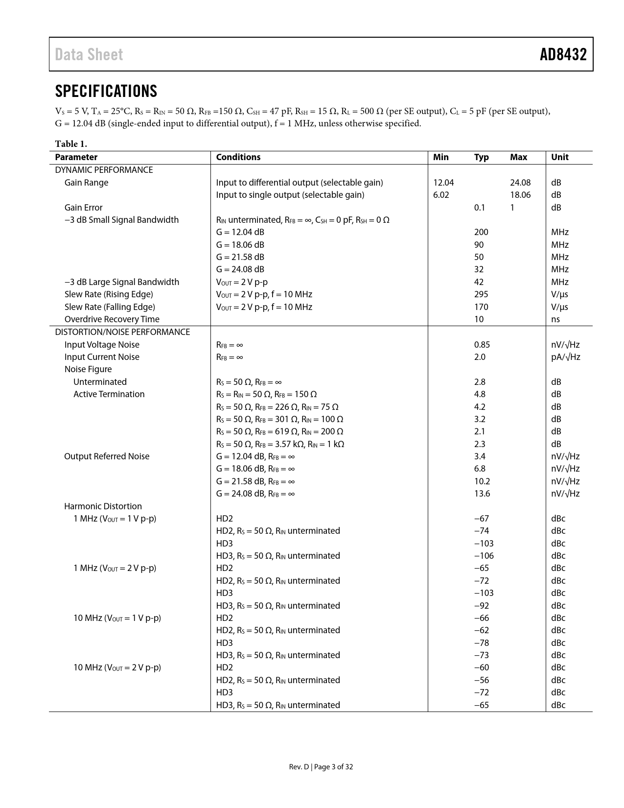 | Pages / Page | 32 / 3 — Data Sheet. AD8432. SPECIFICATIONS. Table 1. Parameter Conditions. Min. … |