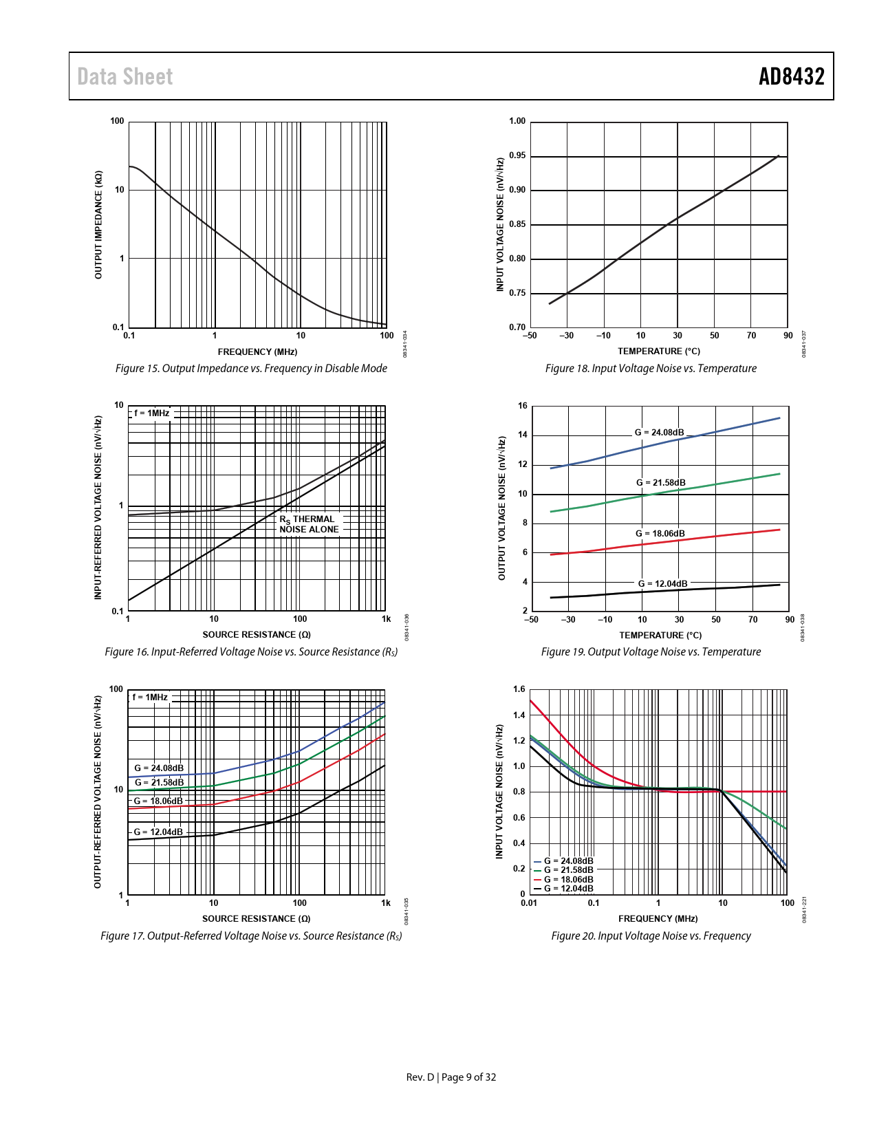 Data SheetAD84321001.00) 0.95)√HzkΩV/(10E(n 0.90E IS ODANC ENP0.85EMGI UTLTAP1O 0.80VUTTOPU IN 0.750.10.700.1110100 4 –50–30–101030507090 7 03 03 1- 1- FREQUENCY (MHz) 34 TEMPERATURE (°C) 34 08 08 Figure 15. Output Impedance vs. Frequency in Disable Mode Figure 18. Input Voltage Noise vs. Temperature 1016)f = 1MHz√HzG = 24.08dBV/)14E (n/√HzISV n12O( EE NISG = 21.58dBG10NOLTA1E GVORS THERMAL8DLTAENOISE ALONEOG = 18.06dBR RVEUT6F EP UTT-RO4PUG = 12.04dBIN0.121101001k 36 38 0 –50–30–101030507090 0 1- 1- SOURCE RESISTANCE (Ω) 34 TEMPERATURE (°C) 34 08 08 Figure 16. Input-Referred Voltage Noise vs. Source Resistance (RS) Figure 19. Output Voltage Noise vs. Temperature 1001.6)f = 1MHz√Hz V/1.4n)ISE (√Hz1.2OV/ (nE N GG = 24.08dB1.0ISE OLTAG = 21.58dB10E N0.8VOG = 18.06dBGED RLTA0.6ERG = 12.04dBVO TEF0.4-RPUTINUG = 24.08dBP T0.2G = 21.58dBUG = 18.06dBOG = 12.04dB10 1 1101001k 35 0.010.1110100 0 22 1- 1- SOURCE RESISTANCE (Ω) 34 FREQUENCY (MHz) 34 08 08 Figure 17. Output-Referred Voltage Noise vs. Source Resistance (RS) Figure 20. Input Voltage Noise vs. Frequency Rev. D | Page 9 of 32 Document Outline FEATURES APPLICATIONS FUNCTIONAL BLOCK DIAGRAM GENERAL DESCRIPTION TABLE OF CONTENTS REVISION HISTORY SPECIFICATIONS ABSOLUTE MAXIMUM RATINGS THERMAL RESISTANCE MAXIMUM POWER DISSIPATION ESD CAUTION PIN CONFIGURATION AND FUNCTION DESCRIPTIONS TYPICAL PERFORMANCE CHARACTERISTICS TEST CIRCUITS THEORY OF OPERATION LOW NOISE AMPLIFIER (LNA) GAIN SETTING TECHNIQUE ACTIVE INPUT RESISTANCE MATCHING APPLICATIONS INFORMATION TYPICAL SETUP I/Q DEMODULATION FRONT END DIFFERENTIAL-TO-SINGLE-ENDED CONVERSION EVALUATION BOARD CONNECTION AND OPERATION Power Supply Input Termination Setting the Amplifier Gain Output SCHEMATIC OUTLINE DIMENSIONS ORDERING GUIDE NOTES NOTES NOTES
