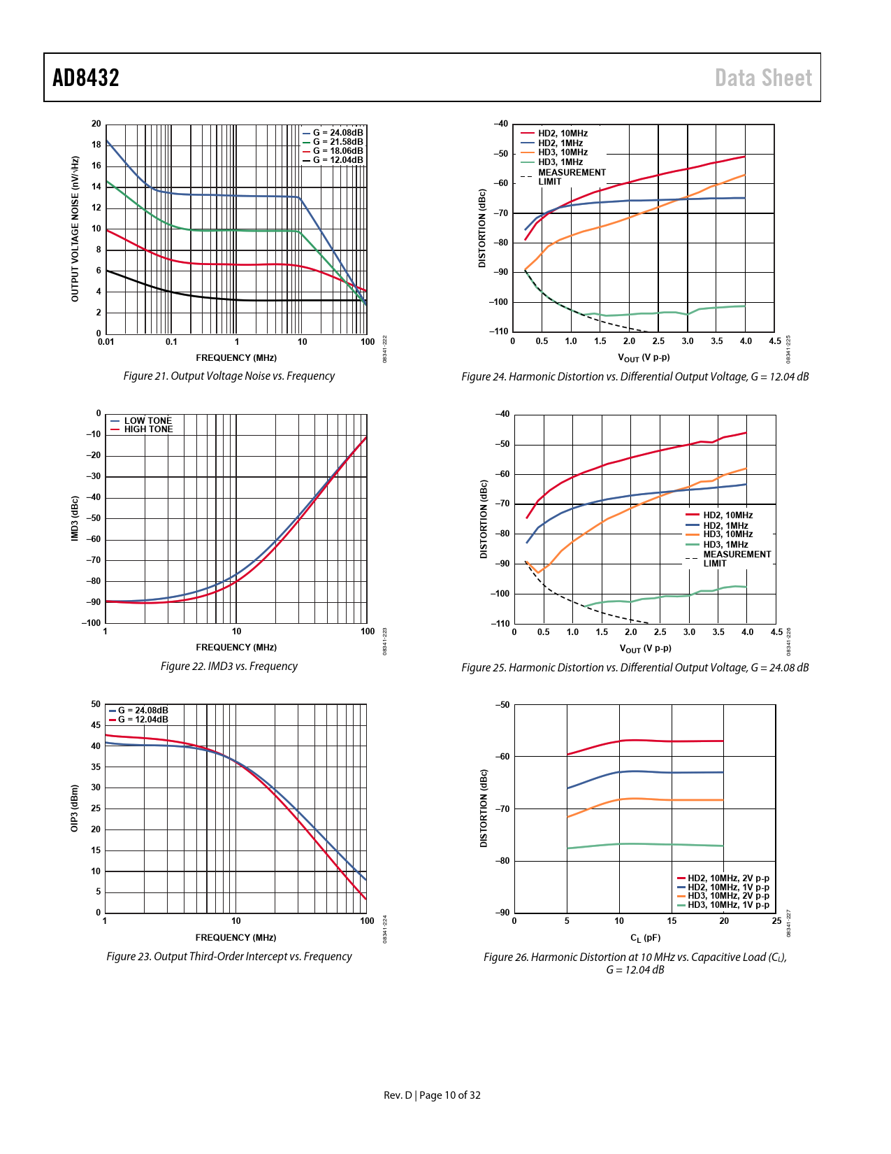 08 Figure 21. Output Voltage Noise vs. Frequency Figure 24. Harmonic Distortion vs. Differential Output Voltage, G = 12.04 dB