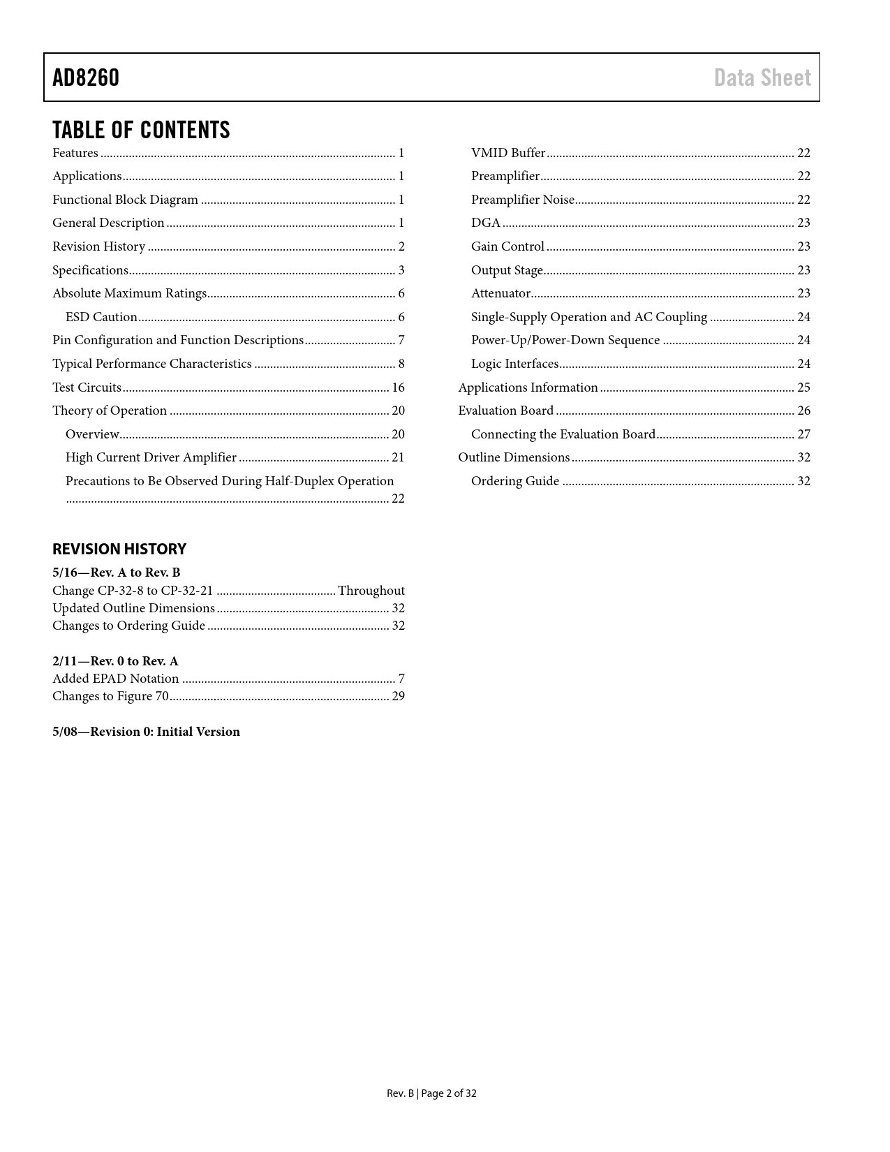 Pages / Page32 / 2 — AD8260. Data Sheet. TABLE OF CONTENTS. REVISION HISTORY. 5/16—Rev. A to …
