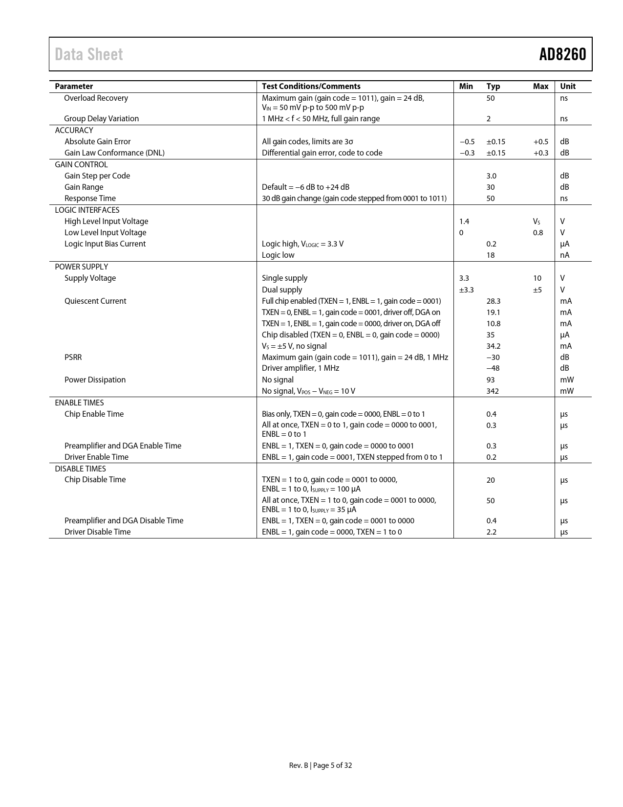 Data SheetAD8260ParameterTest Conditions/CommentsMinTypMaxUnit Overload Recovery Maximum gain (gain code = 1011), gain = 24 dB, 50 ns VIN = 50 mV p-p to 500 mV p-p Group Delay Variation 1 MHz < f < 50 MHz, full gain range 2 ns ACCURACY Absolute Gain Error All gain codes, limits are 3σ −0.5 ±0.15 +0.5 dB Gain Law Conformance (DNL) Differential gain error, code to code −0.3 ±0.15 +0.3 dB GAIN CONTROL Gain Step per Code 3.0 dB Gain Range Default = −6 dB to +24 dB 30 dB Response Time 30 dB gain change (gain code stepped from 0001 to 1011) 50 ns LOGIC INTERFACES High Level Input Voltage 1.4 VS V Low Level Input Voltage 0 0.8 V Logic Input Bias Current Logic high, VLOGIC = 3.3 V 0.2 µA Logic low 18 nA POWER SUPPLY Supply Voltage Single supply 3.3 10 V Dual supply ±3.3 ±5 V Quiescent Current Full chip enabled (TXEN = 1, ENBL = 1, gain code = 0001) 28.3 mA TXEN = 0, ENBL = 1, gain code = 0001, driver off, DGA on 19.1 mA TXEN = 1, ENBL = 1, gain code = 0000, driver on, DGA off 10.8 mA Chip disabled (TXEN = 0, ENBL = 0, gain code = 0000) 35 µA VS = ±5 V, no signal 34.2 mA PSRR Maximum gain (gain code = 1011), gain = 24 dB, 1 MHz −30 dB Driver amplifier, 1 MHz −48 dB Power Dissipation No signal 93 mW No signal, VPOS − VNEG = 10 V 342 mW ENABLE TIMES Chip Enable Time Bias only, TXEN = 0, gain code = 0000, ENBL = 0 to 1 0.4 µs All at once, TXEN = 0 to 1, gain code = 0000 to 0001, 0.3 µs ENBL = 0 to 1 Preamplifier and DGA Enable Time ENBL = 1, TXEN = 0, gain code = 0000 to 0001 0.3 µs Driver Enable Time ENBL = 1, gain code = 0001, TXEN stepped from 0 to 1 0.2 µs DISABLE TIMES Chip Disable Time TXEN = 1 to 0, gain code = 0001 to 0000, 20 µs ENBL = 1 to 0, ISUPPLY = 100 µA All at once, TXEN = 1 to 0, gain code = 0001 to 0000, 50 µs ENBL = 1 to 0, ISUPPLY = 35 µA Preamplifier and DGA Disable Time ENBL = 1, TXEN = 0, gain code = 0001 to 0000 0.4 µs Driver Disable Time ENBL = 1, gain code = 0000, TXEN = 1 to 0 2.2 µs Rev. B | Page 5 of 32 Document Outline FEATURES APPLICATIONS FUNCTIONAL BLOCK DIAGRAM GENERAL DESCRIPTION TABLE OF CONTENTS REVISION HISTORY SPECIFICATIONS ABSOLUTE MAXIMUM RATINGS ESD CAUTION PIN CONFIGURATION AND FUNCTION DESCRIPTIONS TYPICAL PERFORMANCE CHARACTERISTICS TEST CIRCUITS THEORY OF OPERATION OVERVIEW HIGH CURRENT DRIVER AMPLIFIER PRECAUTIONS TO BE OBSERVED DURING HALF-DUPLEX OPERATION VMID BUFFER PREAMPLIFIER PREAMPLIFIER NOISE DGA GAIN CONTROL OUTPUT STAGE ATTENUATOR SINGLE-SUPPLY OPERATION AND AC COUPLING POWER-UP/POWER-DOWN SEQUENCE LOGIC INTERFACES APPLICATIONS INFORMATION EVALUATION BOARD CONNECTING THE EVALUATION BOARD OUTLINE DIMENSIONS ORDERING GUIDE
