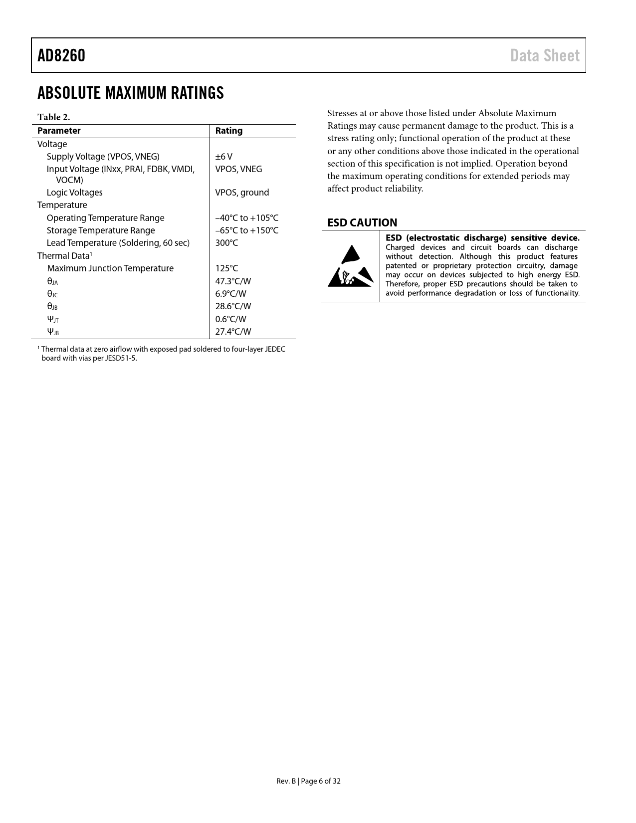 Pages / Page32 / 6 — AD8260. Data Sheet. ABSOLUTE MAXIMUM RATINGS. Table 2. Parameter Rating. …